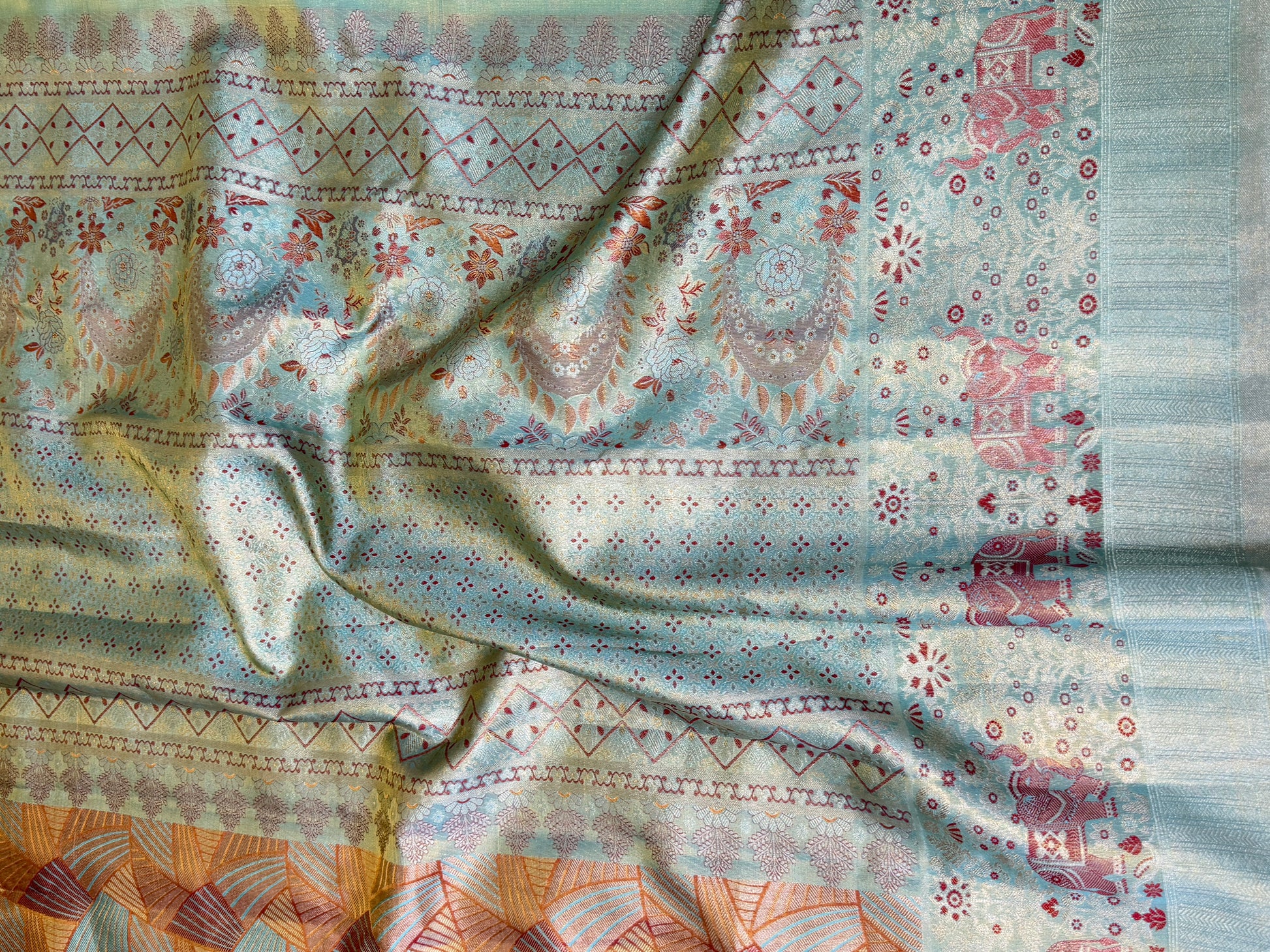 This pure silk handloom saree is a celebration of traditional weaving and contemporary design. The body features intricate geometric patterns woven with zari in copper, aqua blue, and peach tones, creating a striking visual rhythm. The border and pallu carry auspicious elephant motifs highlighted with floral zari detailing, symbolizing prosperity, strength, and celebration.