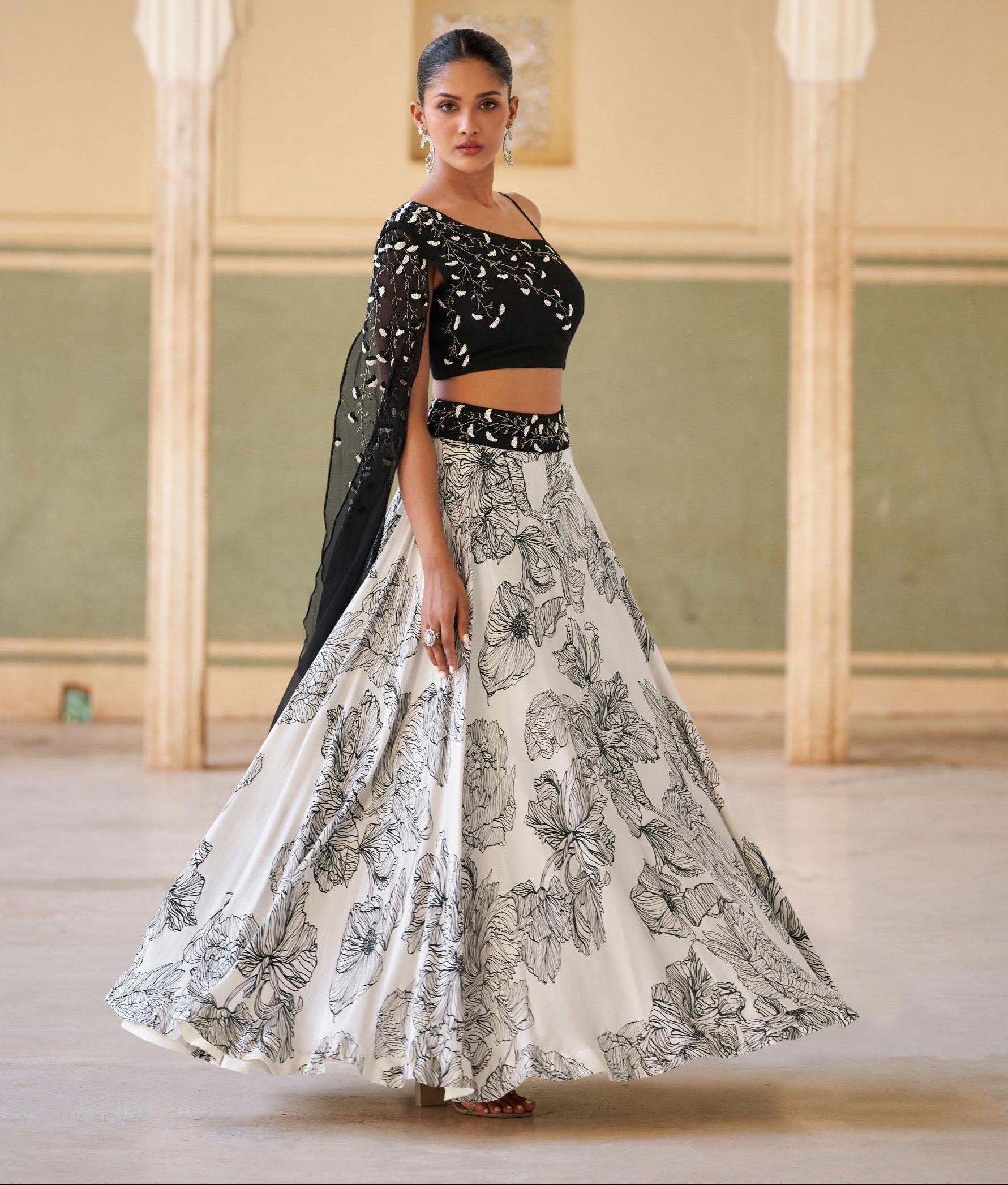Real chinon embroidered crop top lehenga set for women with cancan – black & white floral pattern