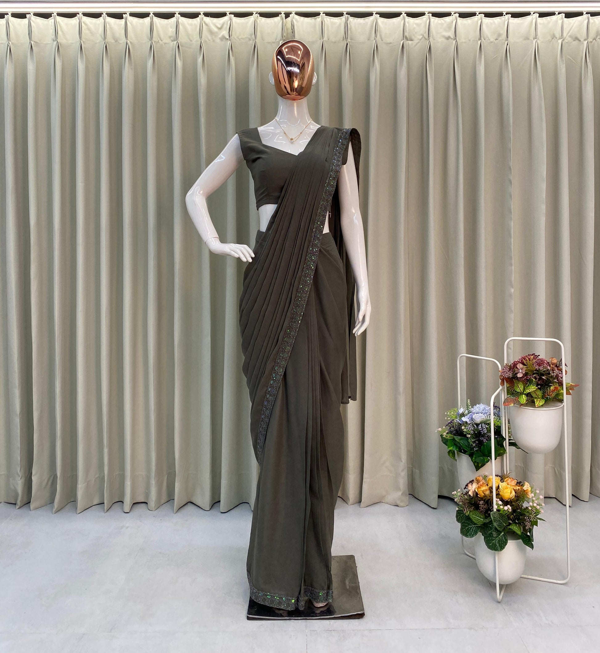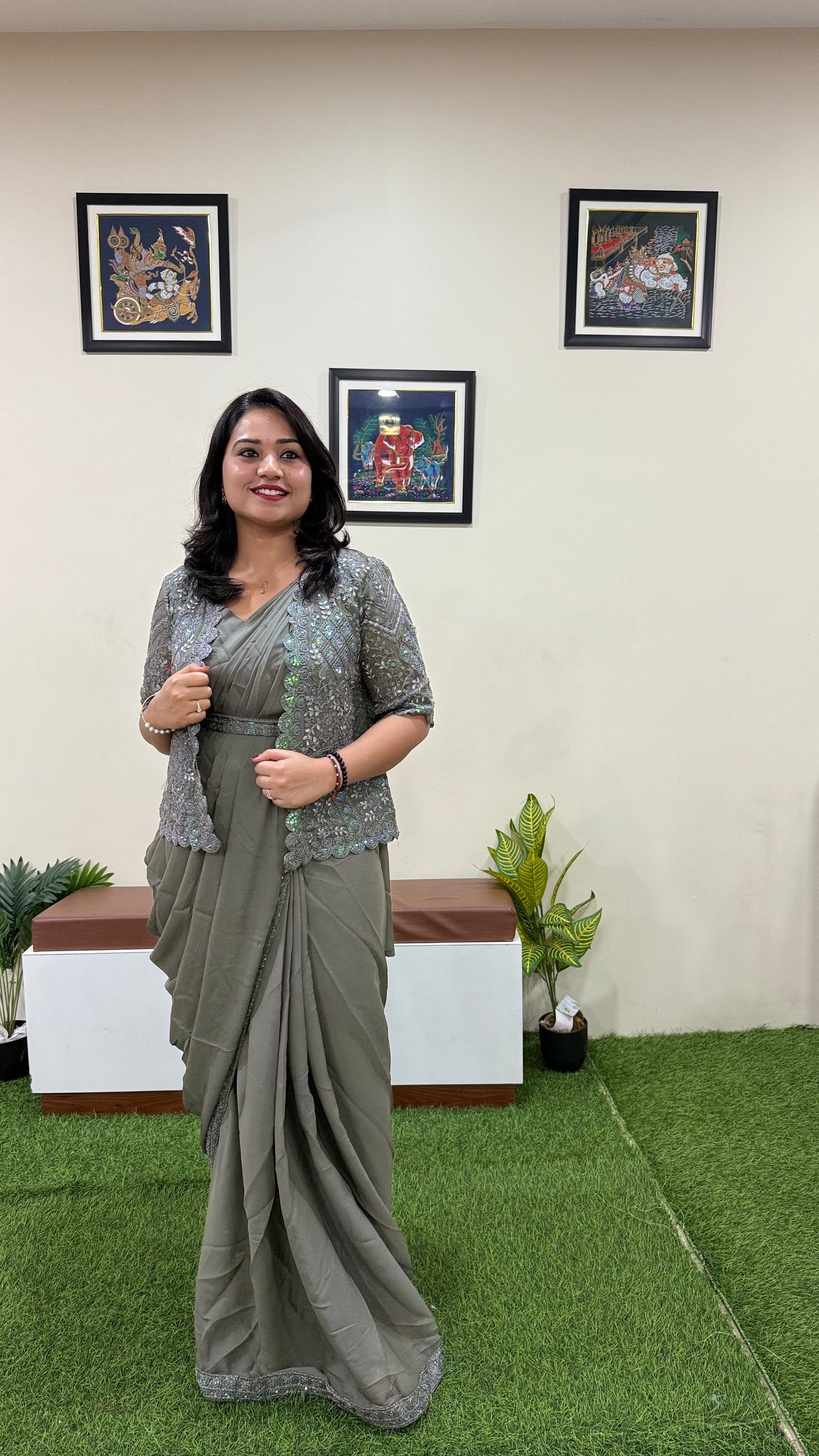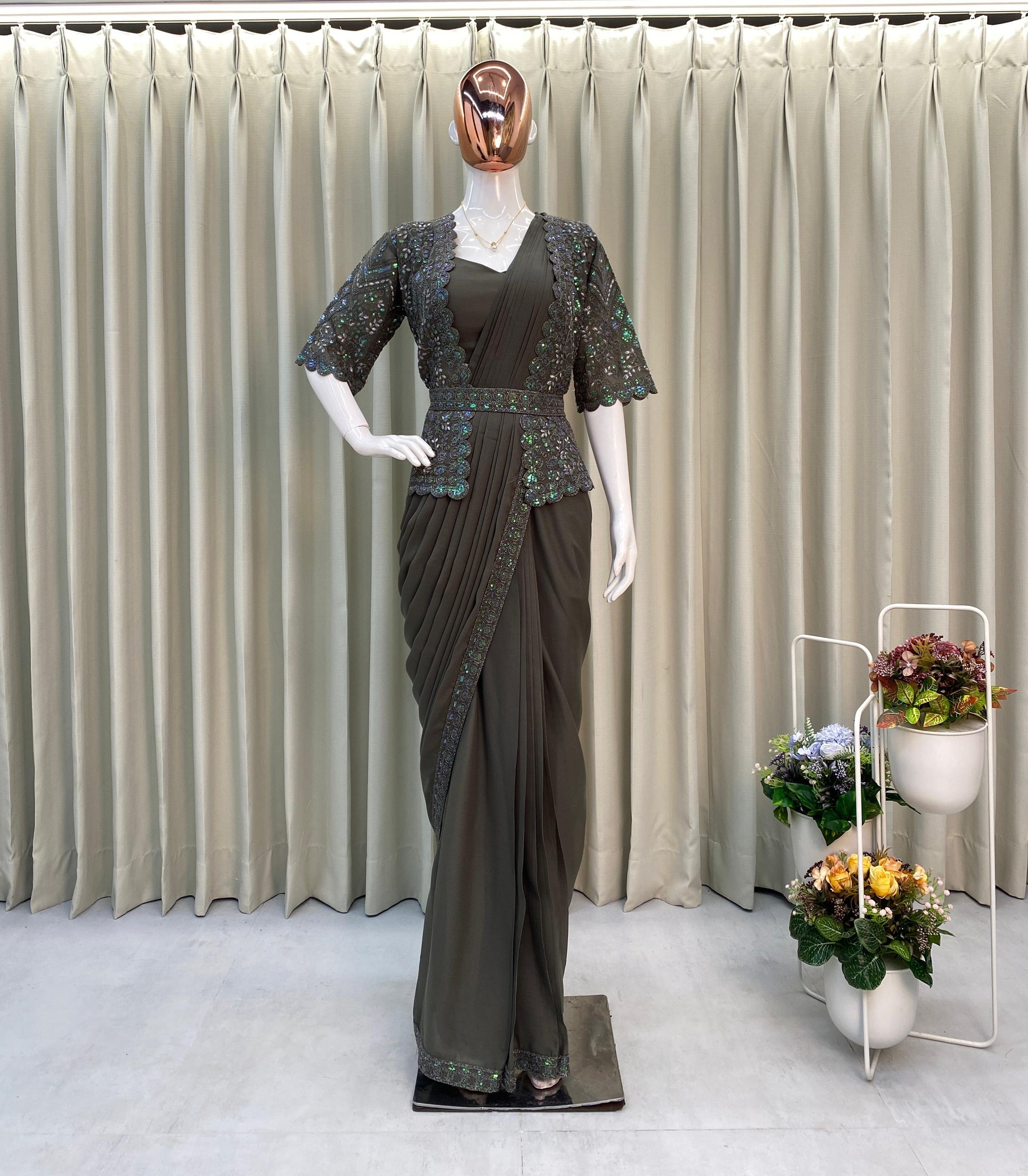 This ready-to-wear saree combines contemporary style with traditional elegance, designed for effortless draping and all-day comfort. Made from premium star georgette fabric, the saree features shimmering all-over sequence embroidery, creating a glamorous yet refined look. It is paired with a fully stitched blouse that fits up to XXL, a beautifully embroidered koti jacket for a modern touch, and a stylish work belt to enhance the silhouette. Lightweight and easy to wear, this saree is perfect for festive occasions, receptions, cultural celebrations, and parties, ensuring you stand out with grace and style.