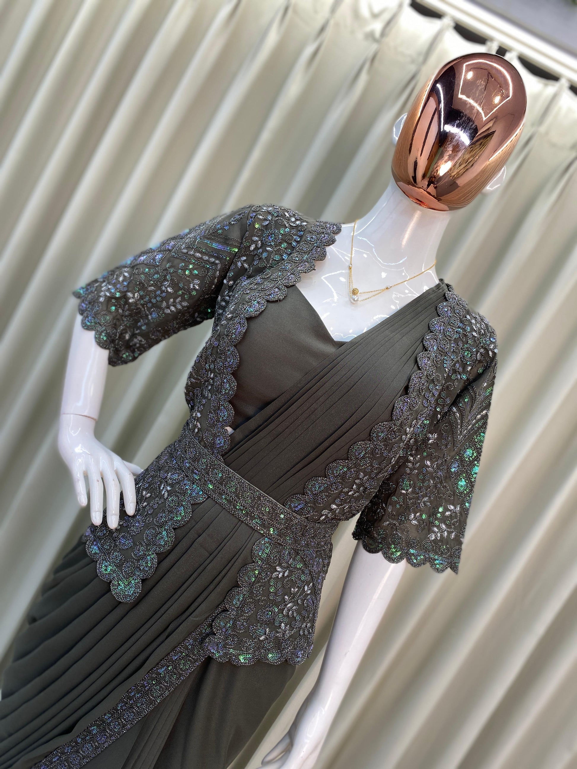 • Work/Design: All-over shimmering sequence embroidery with intricate detailing