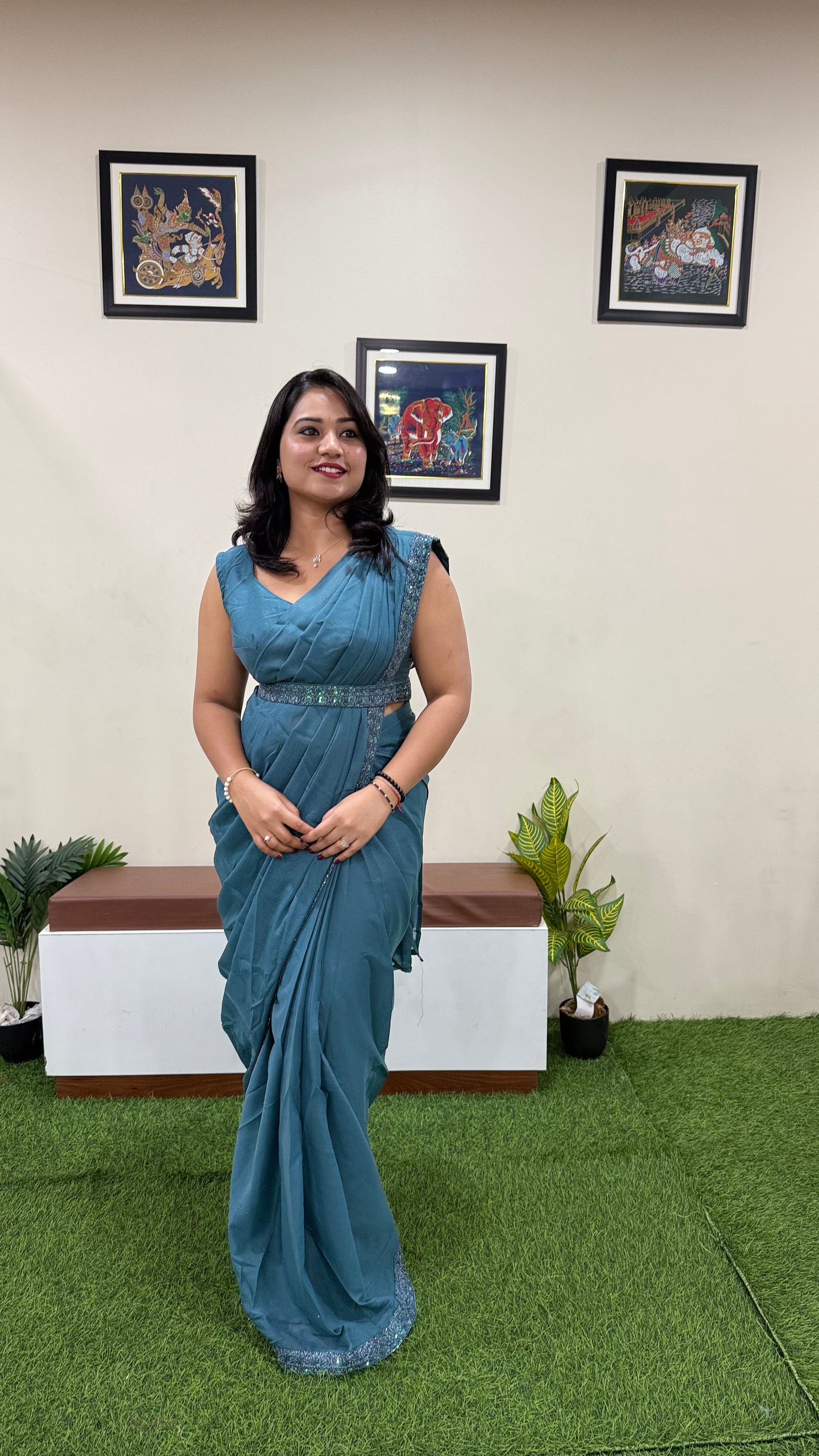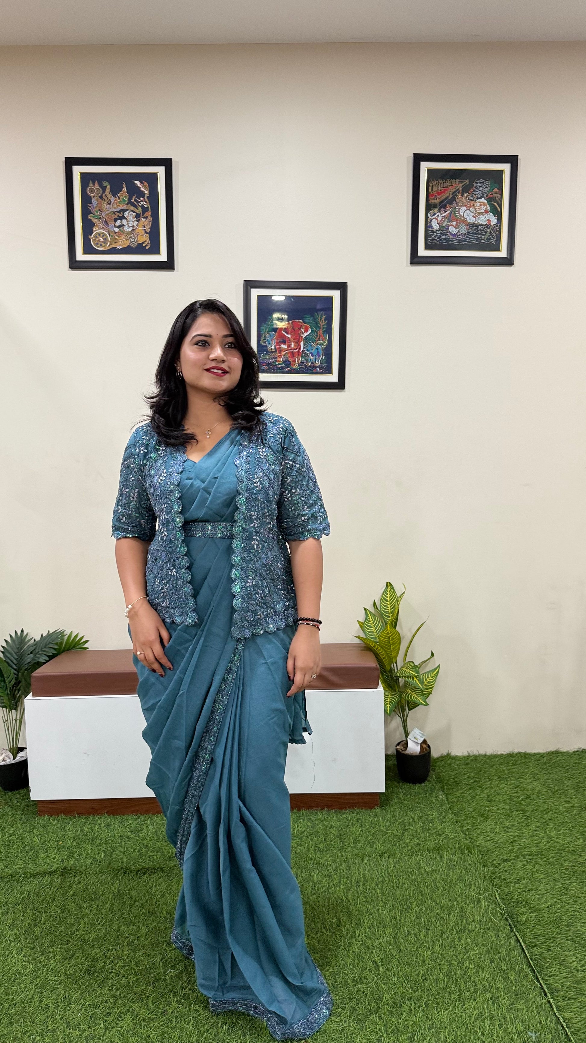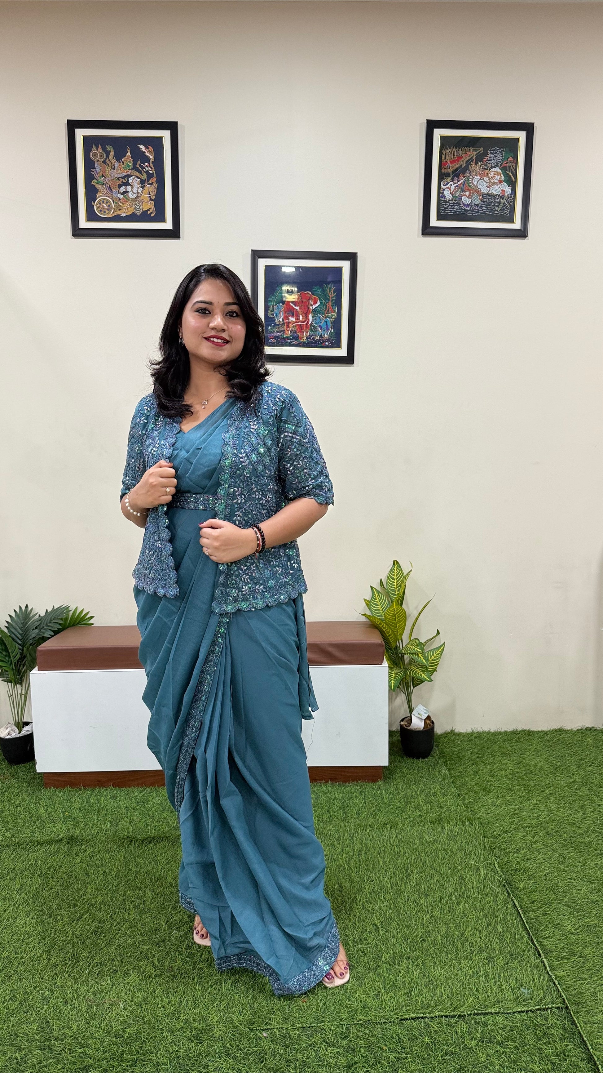 This ready-to-wear saree combines contemporary style with traditional elegance, designed for effortless draping and all-day comfort. Made from premium star georgette fabric, the saree features shimmering all-over sequence embroidery, creating a glamorous yet refined look. It is paired with a fully stitched blouse that fits up to XXL, a beautifully embroidered koti jacket for a modern touch, and a stylish work belt to enhance the silhouette. Lightweight and easy to wear, this saree is perfect for festive occasions, receptions, cultural celebrations, and parties, ensuring you stand out with grace and style.