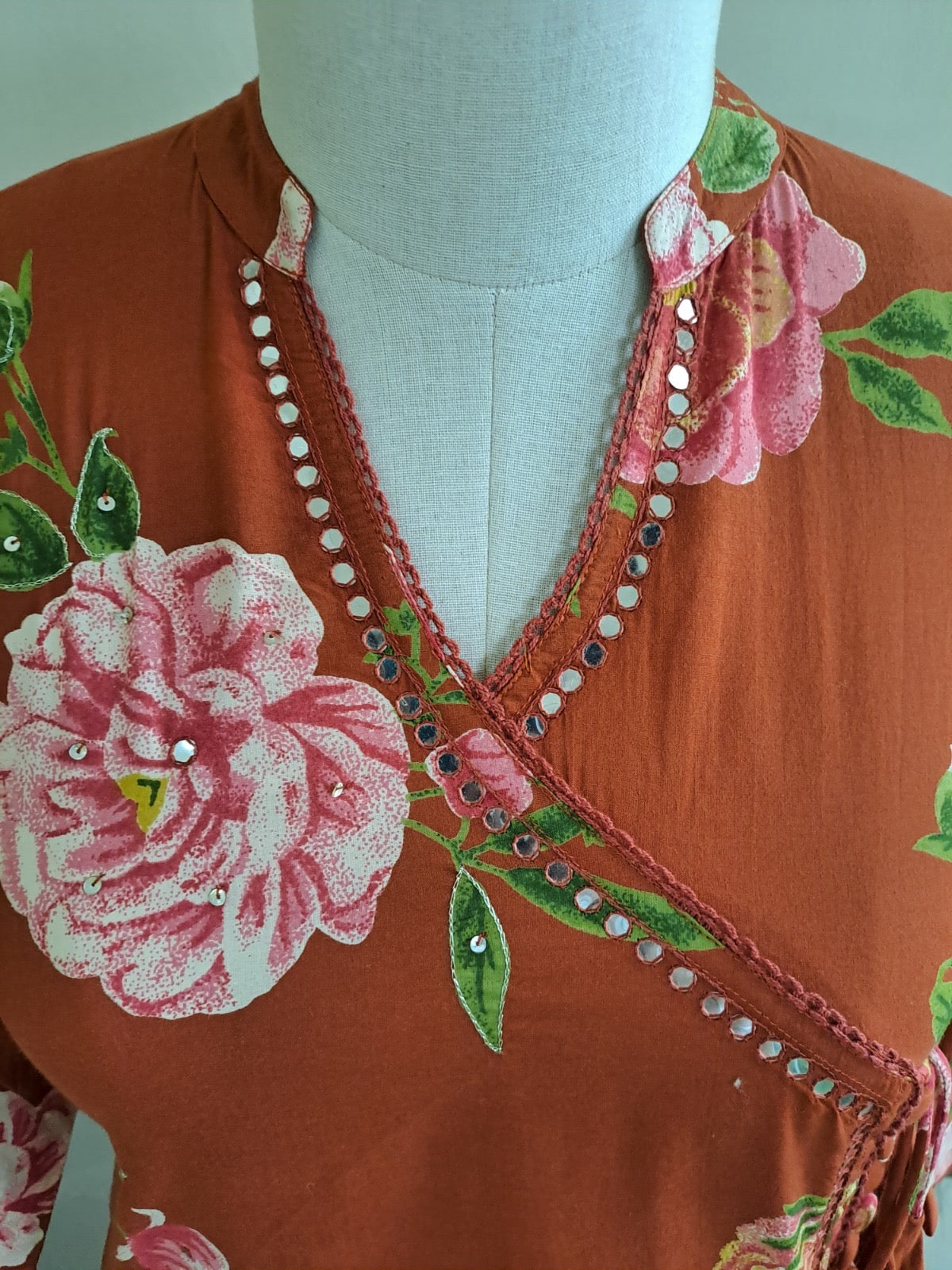 This rust orange 3-piece cotton kurta set brings together vibrant floral prints, delicate thread embroidery, and flex mirror accents to create a modern ethnic look. Made from breathable premium printed cotton, the kurta features a flattering diagonal panel design with detailed embroidery on the neckline and yoke. The set is completed with coordinated cotton pants and a matching dupatta, making it an ideal choice for casual festive events, gatherings, and daily wear. Designed for style and comfort, it is available in sizes 38 to 46.