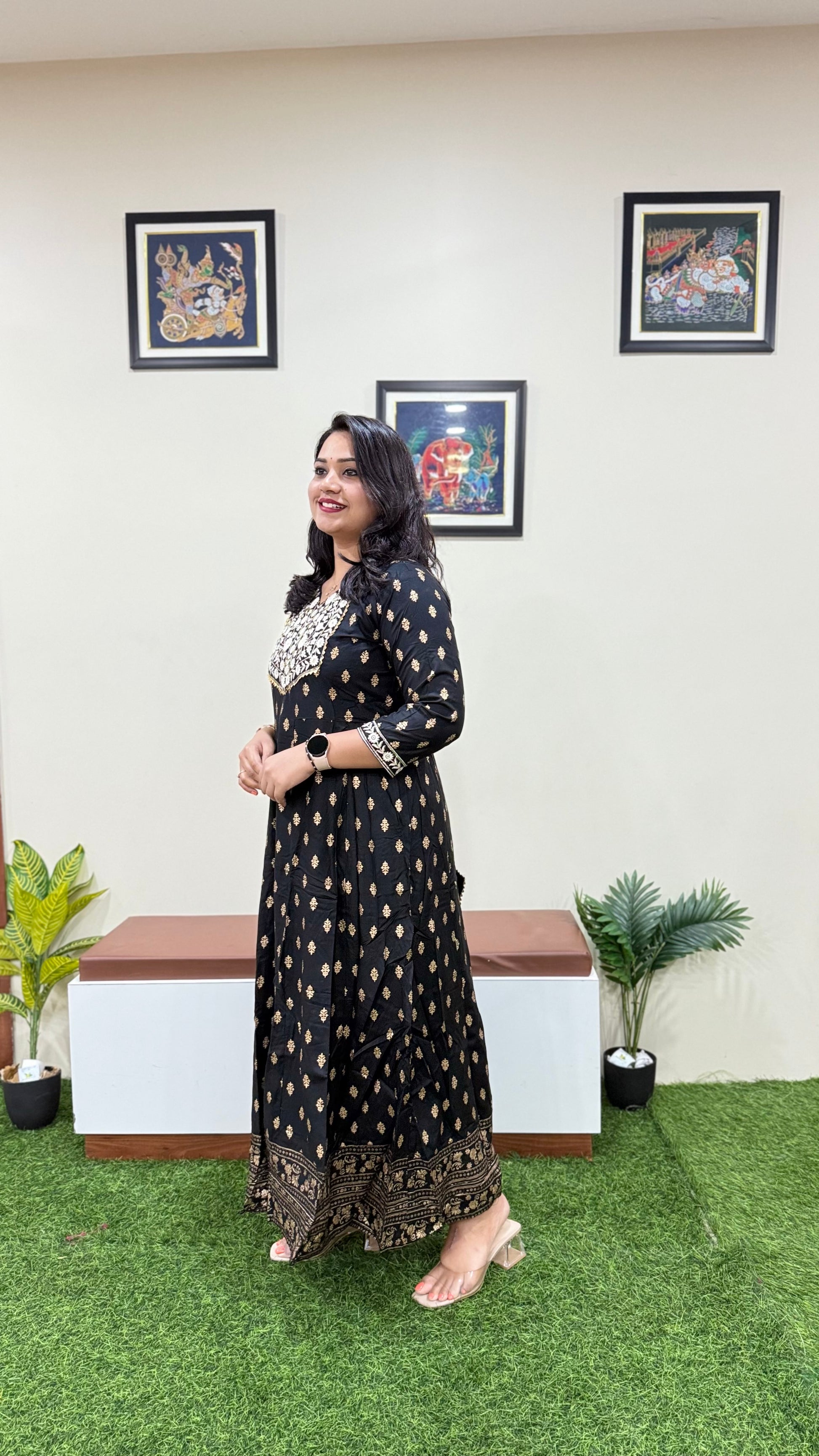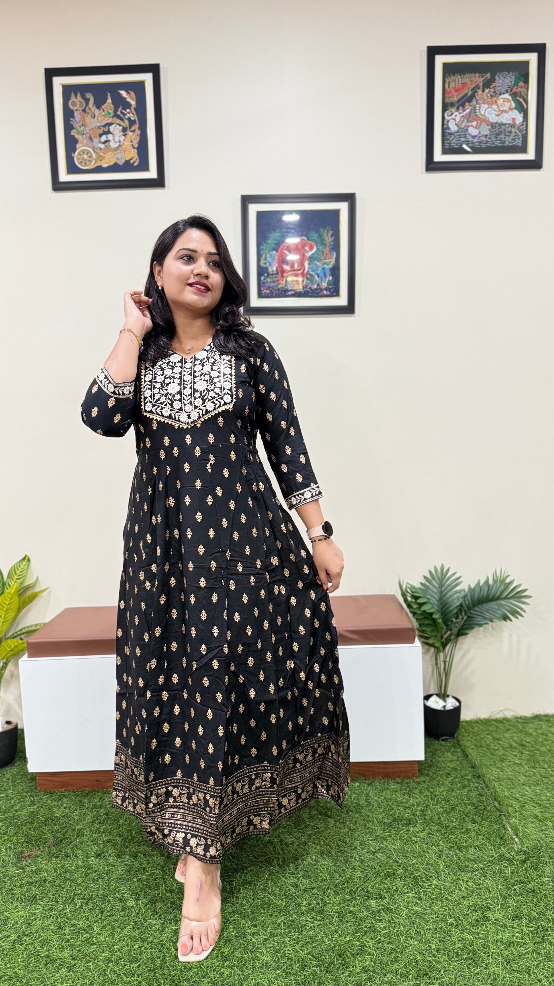 Delight in the luxurious feel of rayon fabric, enveloping you in sophistication and comfort. Available in sizes M, L, XL, XXL, and 3XL, each gown is a masterpiece designed to flatter every silhouette. With 8 enchanting designs to choose from, your style journey begins here.