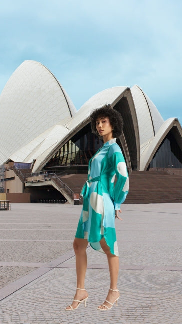 SEO Keywords: satin abstract button down dress for women, belted mini shirt dress, resort wear outfit