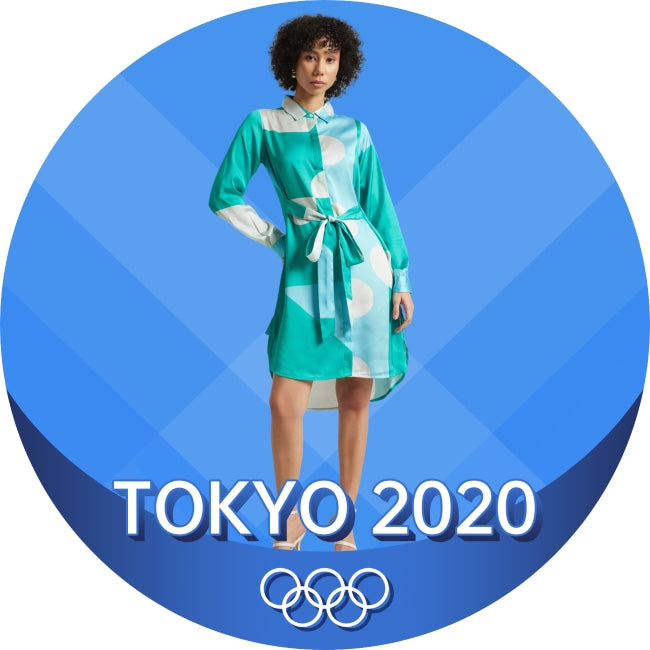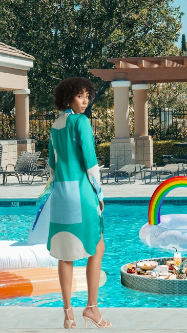 Design/Work: Bold teal-and-white abstract print with shirt-style button closure