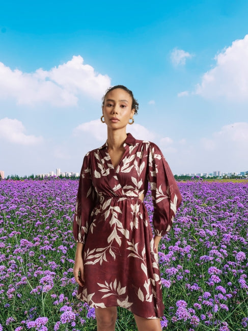 This satin abstract side cut-out dress combines modern detailing with a relaxed, beach-ready elegance. Crafted from smooth satin, it features a maroon base adorned with a soft white botanical abstract print, creating a fresh yet sophisticated look. The side cut-out detail adds a touch of allure while maintaining comfort. Designed with long sleeves and a mini length, this dress is ideal for warm-weather escapes and day-to-evening wear. The V-neckline frames the face beautifully, while the lightweight satin drapes effortlessly for a flattering silhouette. Perfect for vacation wear, brunches, or resort evenings, it offers versatile styling for any casual-chic occasion.