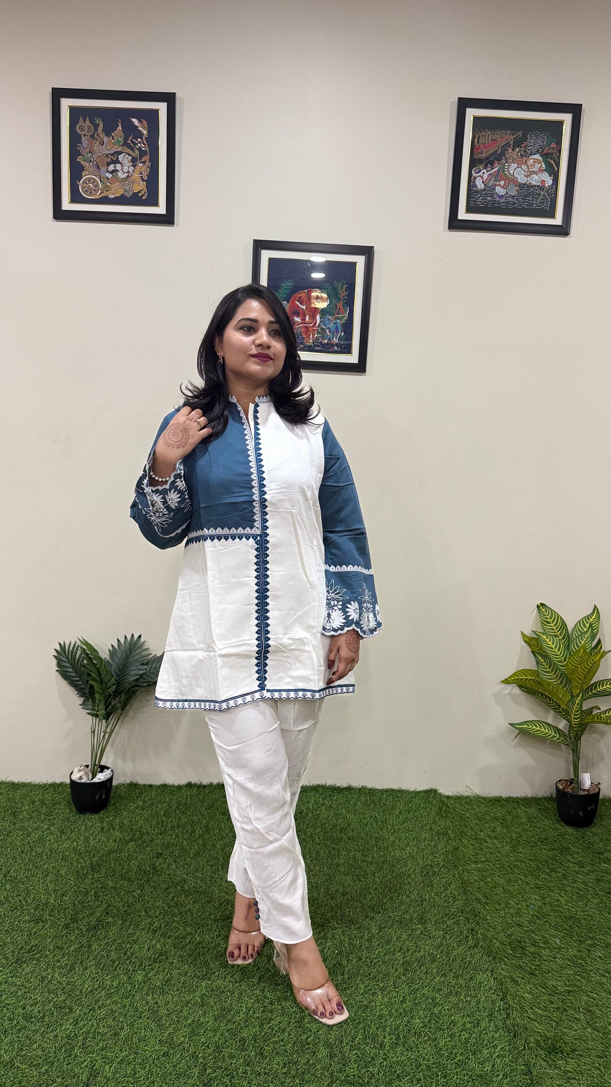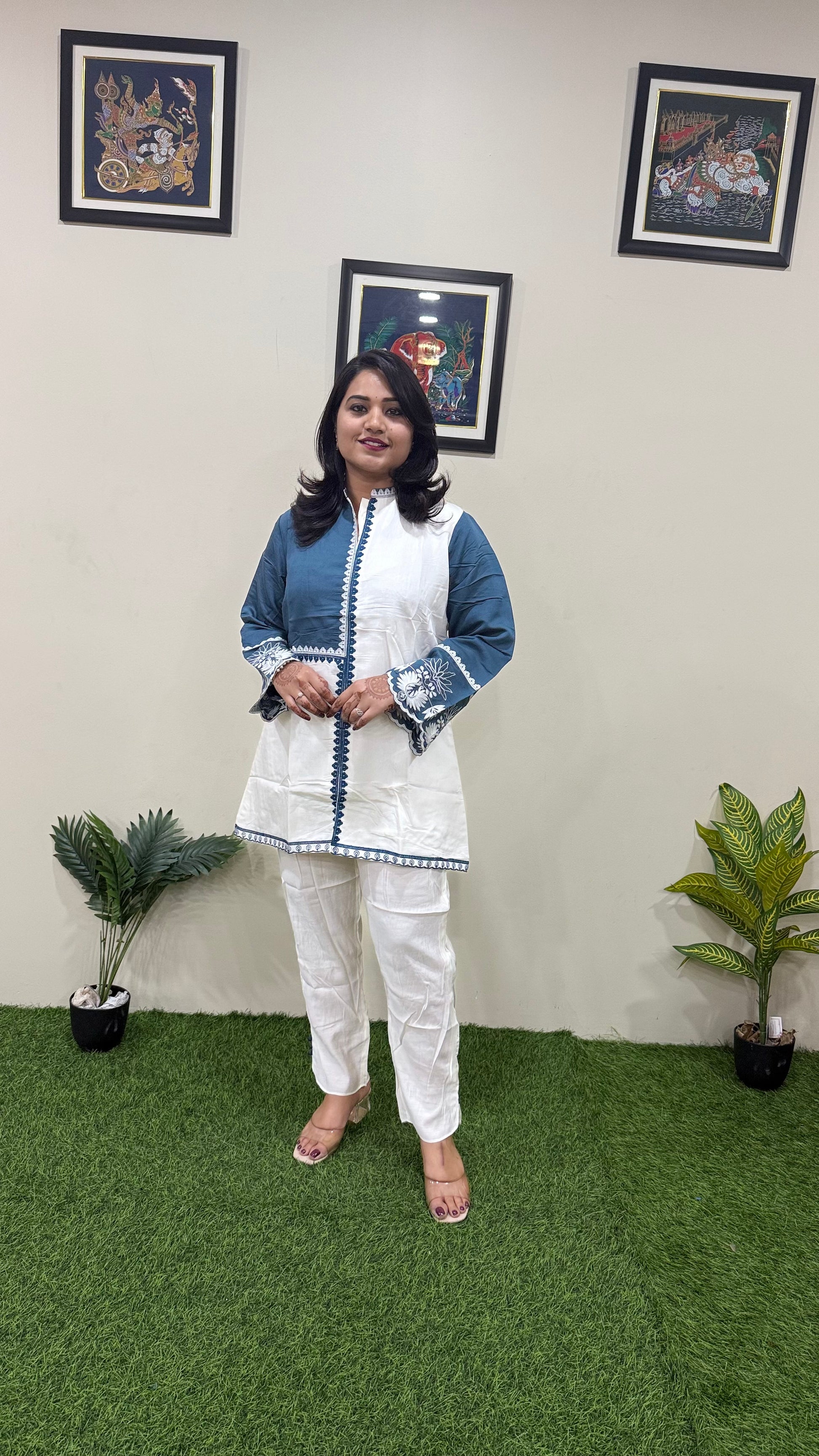 The top is tailored in a long, tunic-style silhouette with a straight hem, featuring a white front panel offset by rich teal sleeves and back. The neckline, placket, hem, and sleeves are adorned with thread-embroidered motifs and ornamental trims that add character without overpowering the minimal base. The sleeve cuffs are detailed with bold floral embroidery, making them a focal point of the outfit. A scallop-style blue trim runs along the front and bottom hem, enhancing the definition of the design.