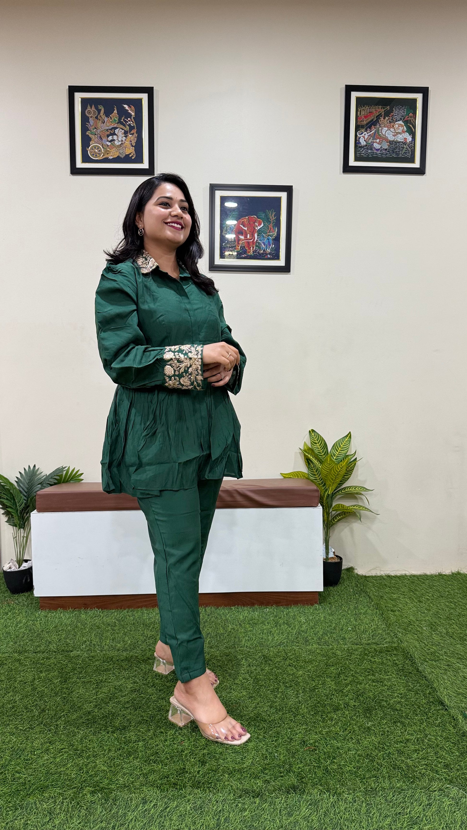 Women's Pure Silk Co-ord Set in Deep Green with Embroidered Collar and Cuff Detail