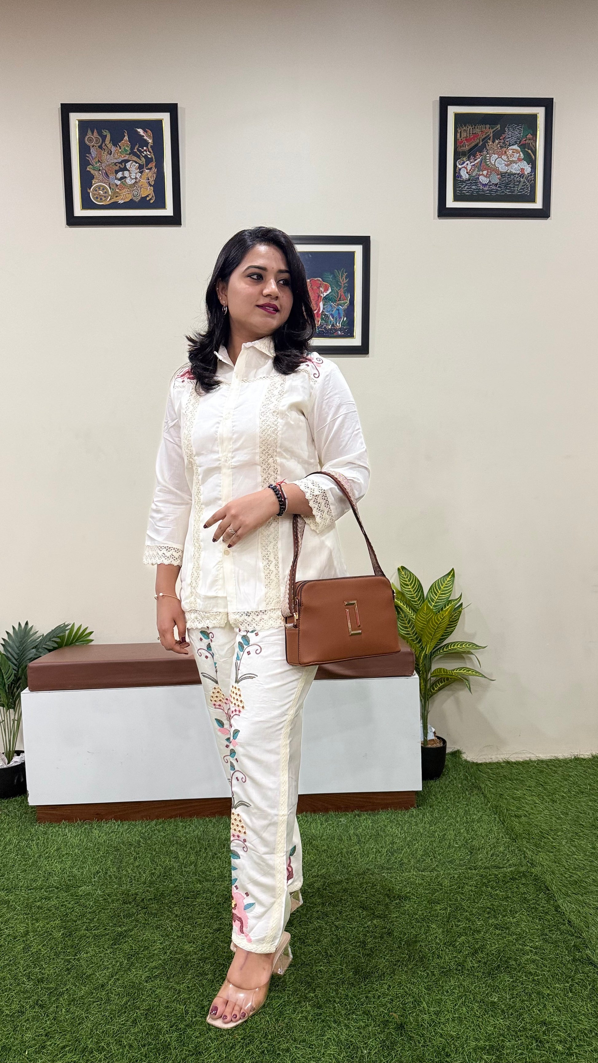 Work Type: Thread embroidery on pants; lace detailing on shirt
