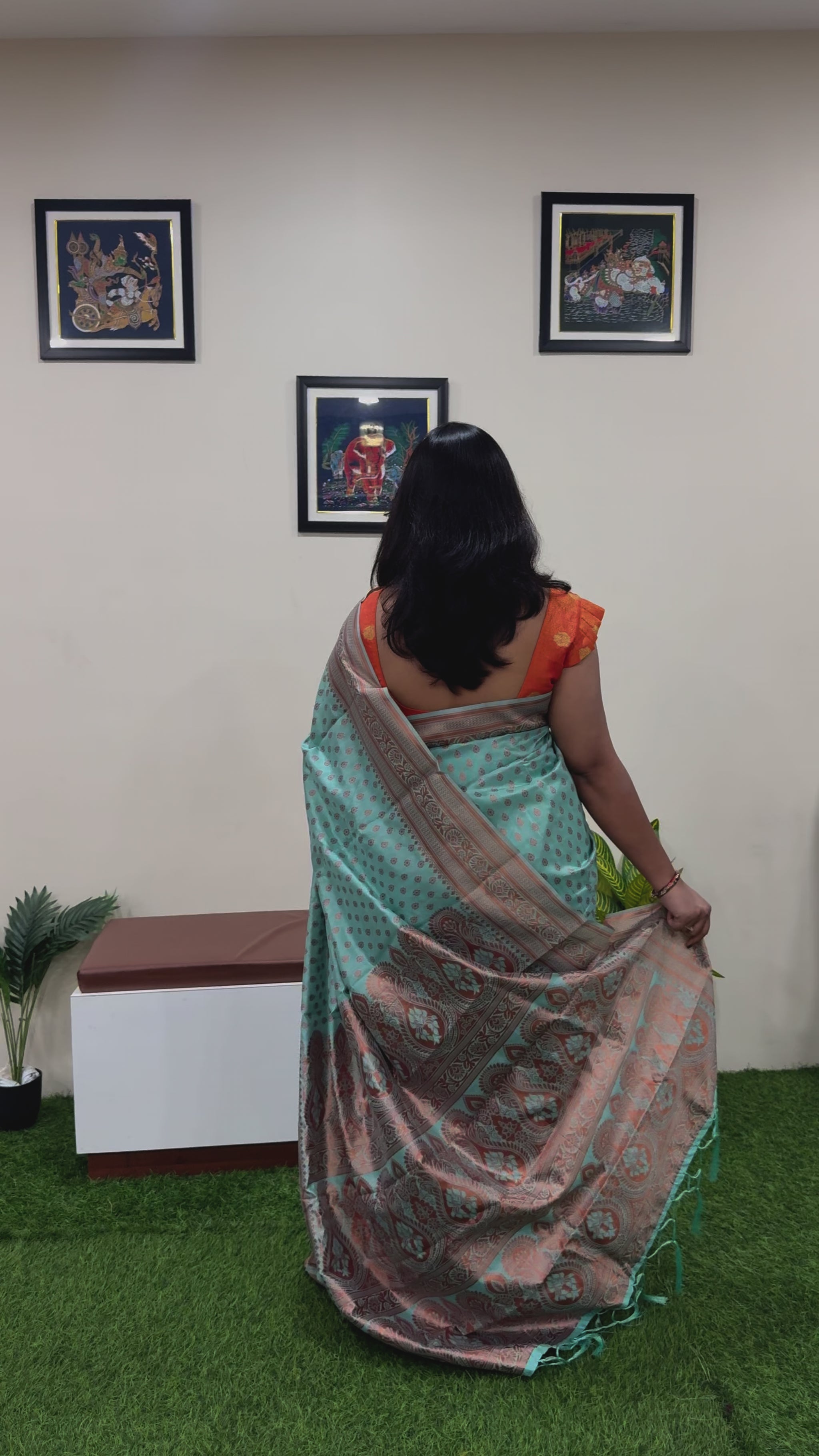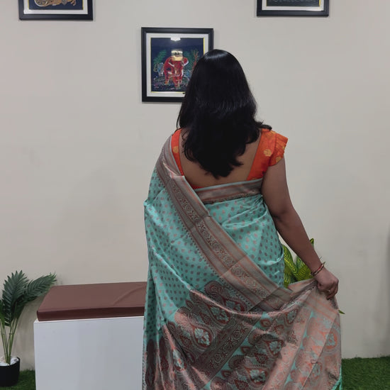 This semi-Chanderi silk saree features elegant woven patterns and a subtle sheen, offering a graceful drape suitable for festive and traditional occasions. Crafted with fine threads and finished with a classic zari border, it delivers timeless charm and cultural elegance. Ideal for women seeking lightweight yet rich ethnic wear, this saree pairs beautifully with traditional blouses and accessories for pujas, celebrations, or cultural gatherings.
