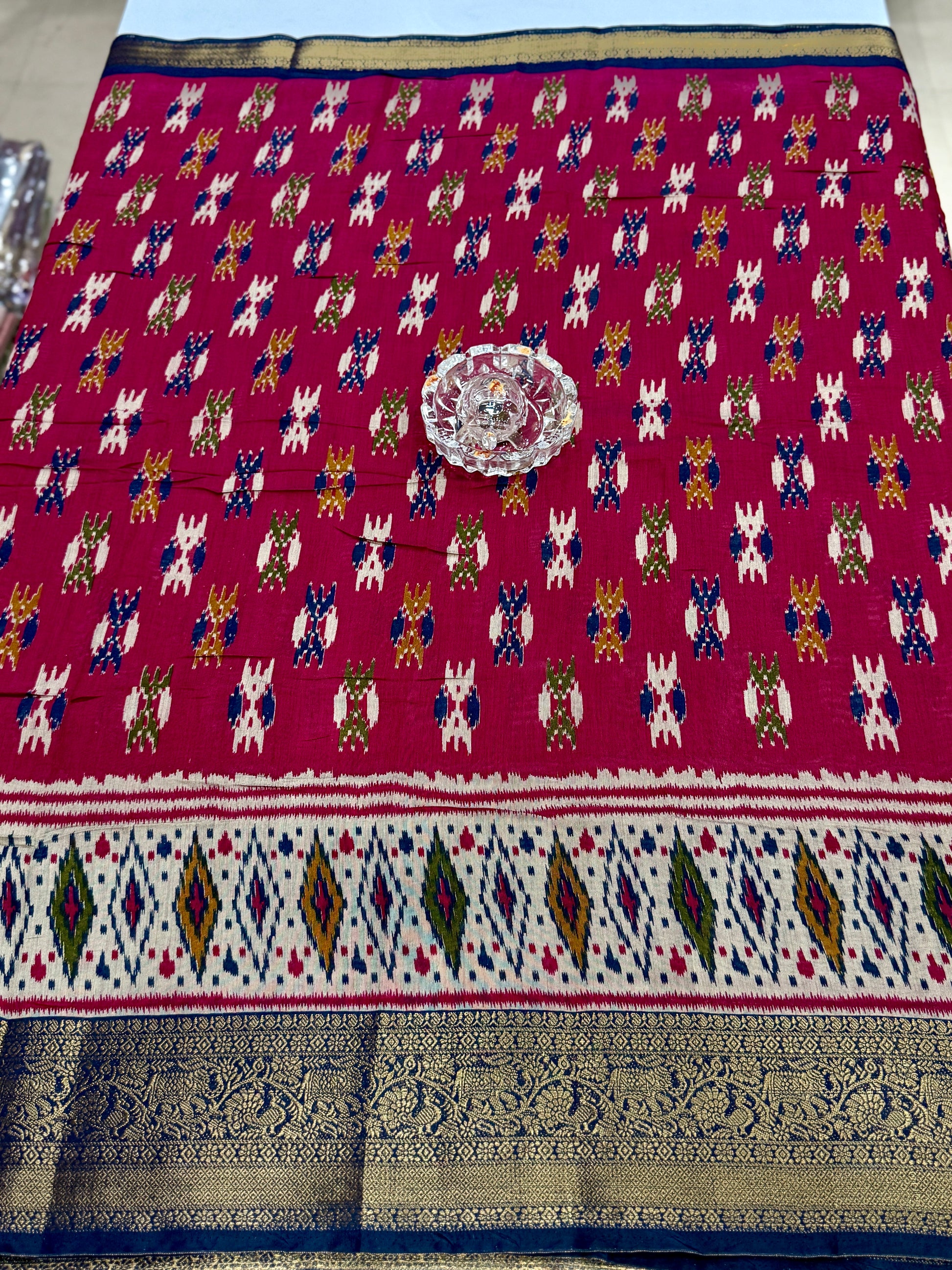 Weaving: Ikat-style motifs with zari-woven contrast border