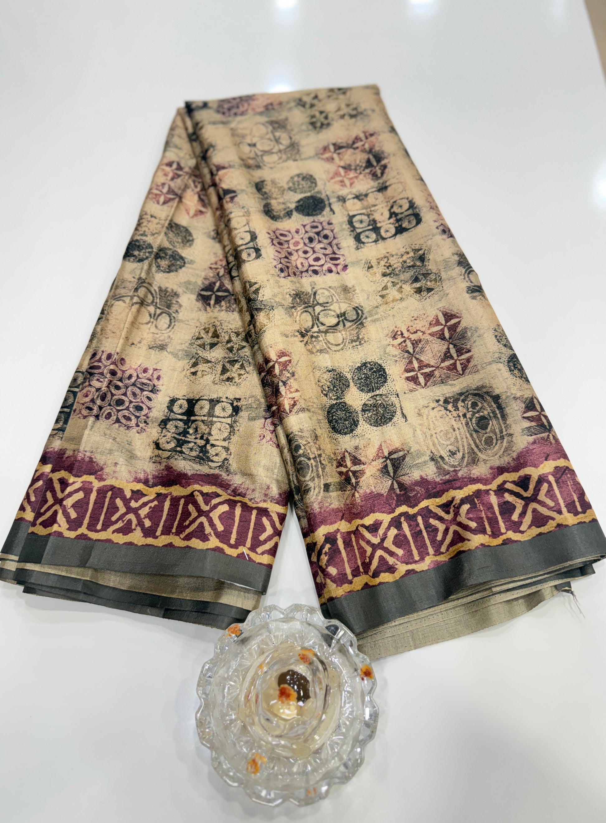 This tussar art silk saree exemplifies traditional craftsmanship with its striking ethnic print motifs woven throughout the body, complemented by an intricately detailed printed border that frames the silhouette. The pallu features decorative tassels that add movement and elegance to your drape.