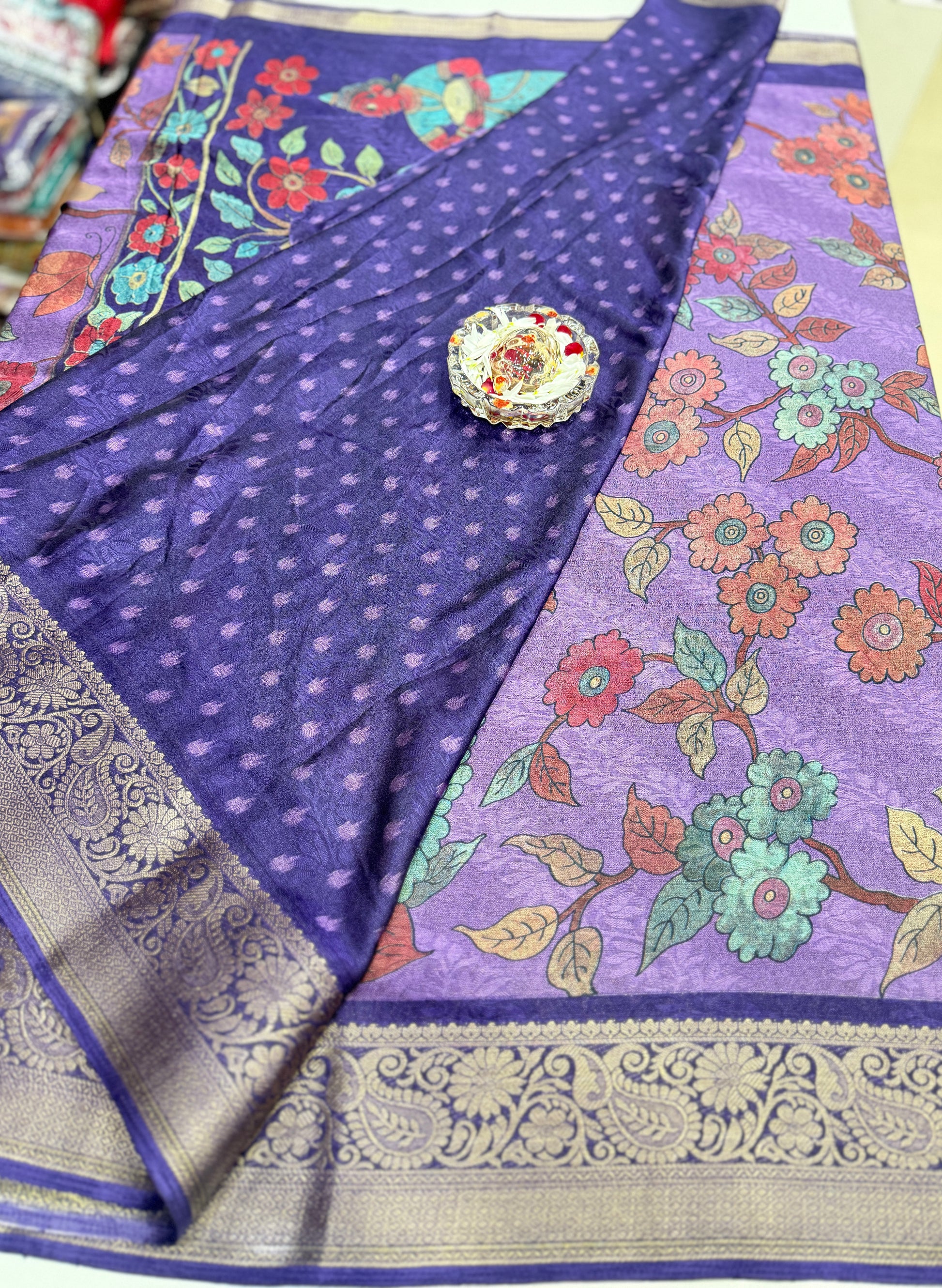 Work/design: printed body with statement pallu artwork; zari border with traditional pattern detailing