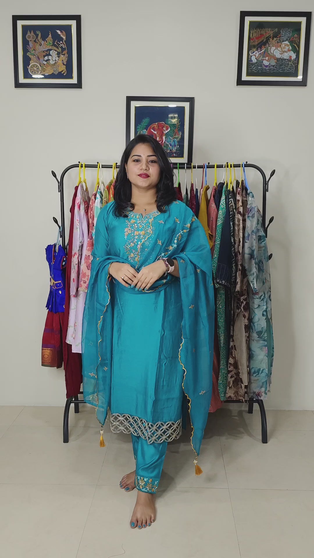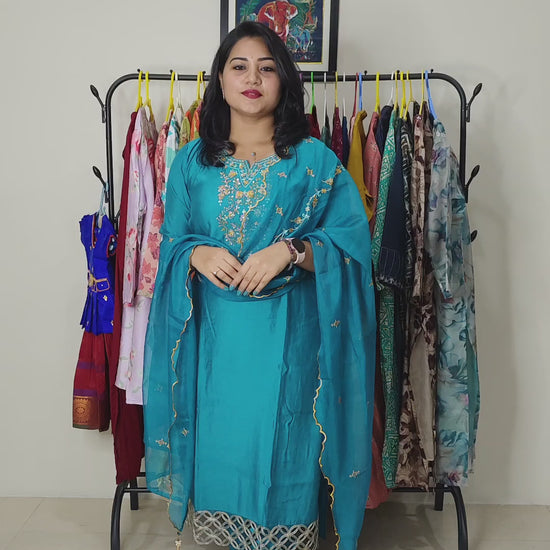 Milan Silk Handworked Kurta Pant Dupatta Set with Embroidered Organza Dupatta – Sizes M to XXL