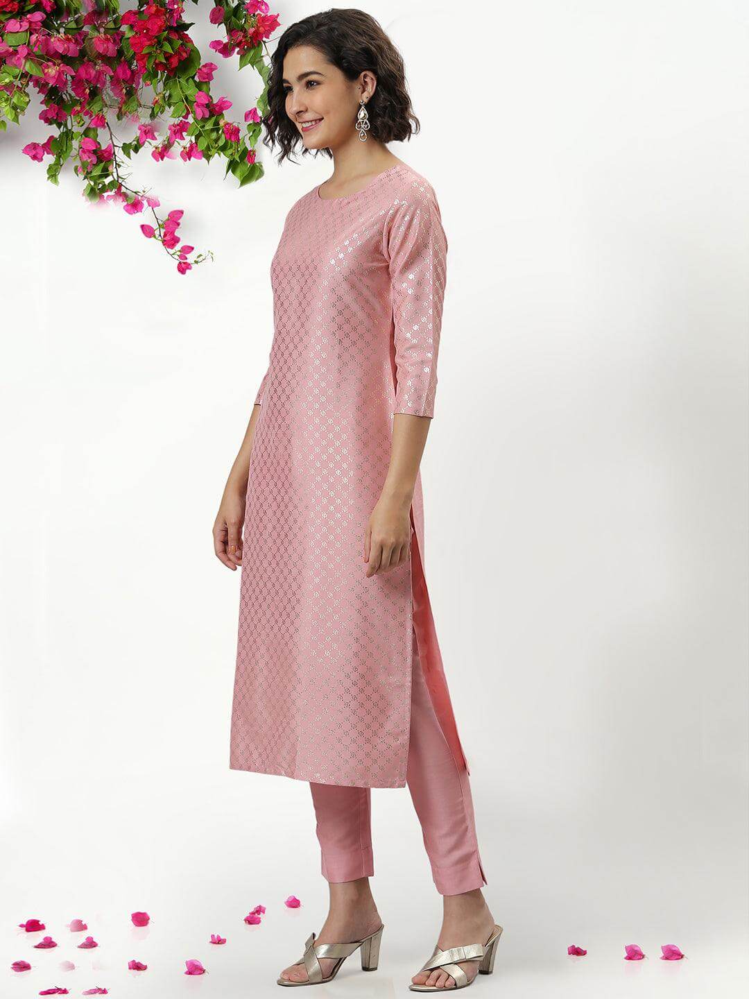 This silk blend kurti pant set combines festive charm with everyday elegance. The kurti is designed in a soft pink tone with delicate foil print work across the fabric, giving it a subtle shimmer that enhances its appeal. Tailored in a straight-fit silhouette, it features 3/4 regular sleeves and a round neckline for a timeless look. The coordinating straight pants are crafted in matching fabric, offering both comfort and sophistication. Fully stitched and available in XL to 3XL sizes, this set is designed for women who seek style with ease of movement. Ideal for festive gatherings, office events, or casual wear, it offers a versatile outfit option that balances grace and comfort.