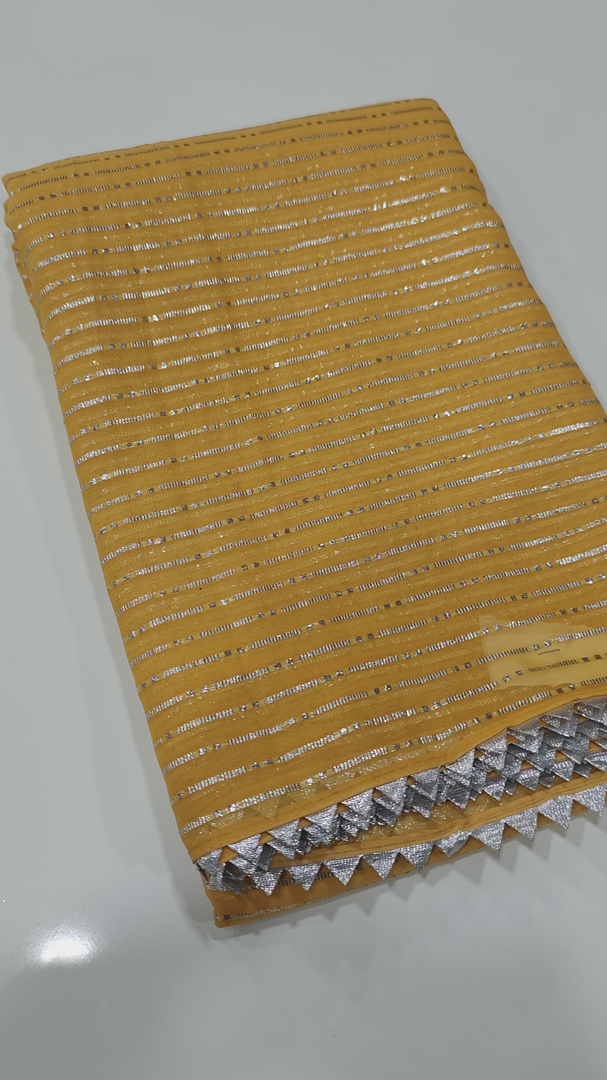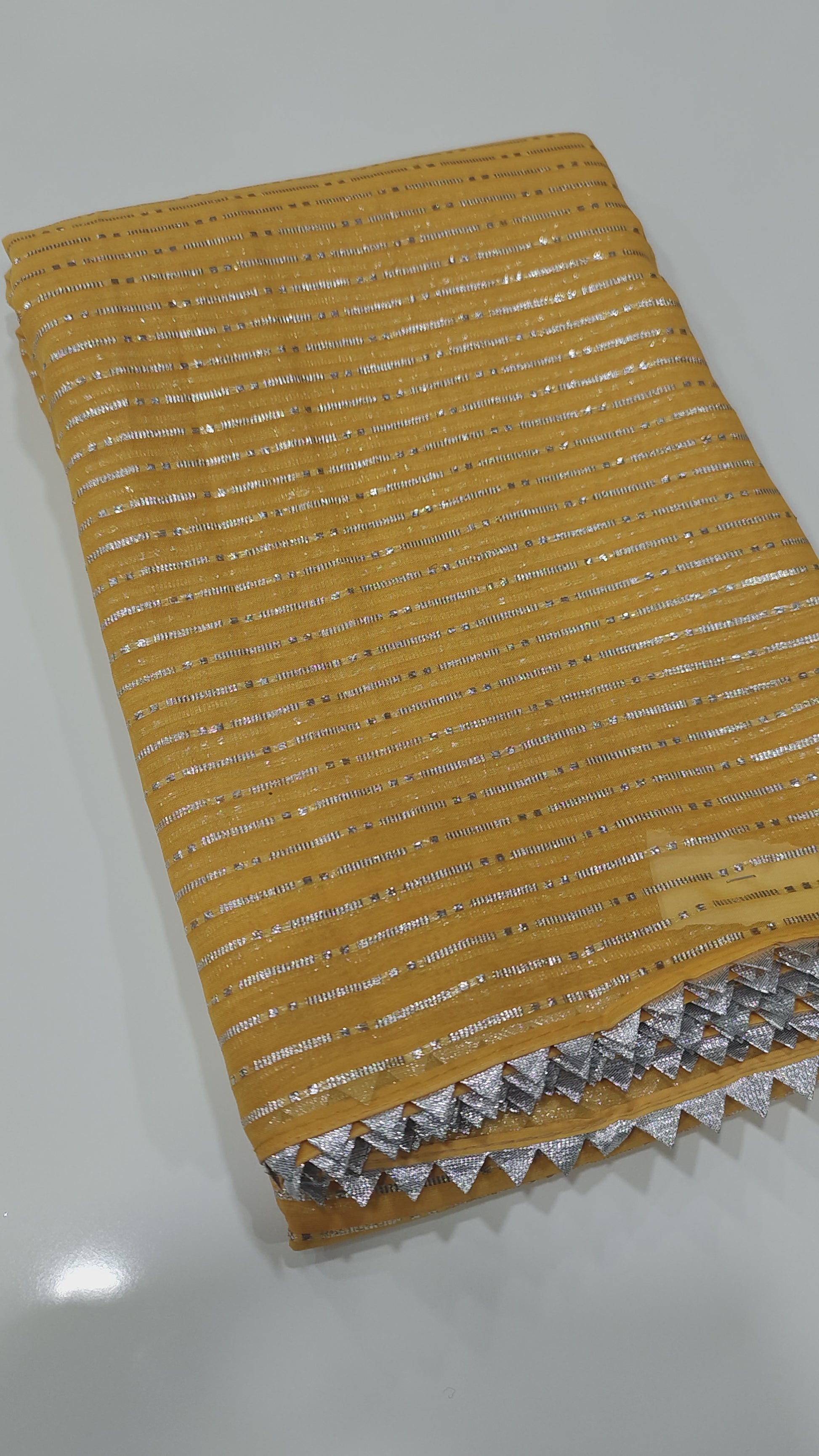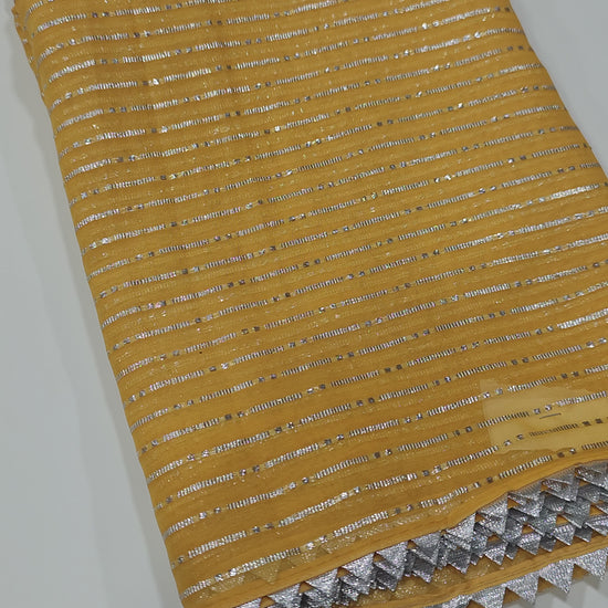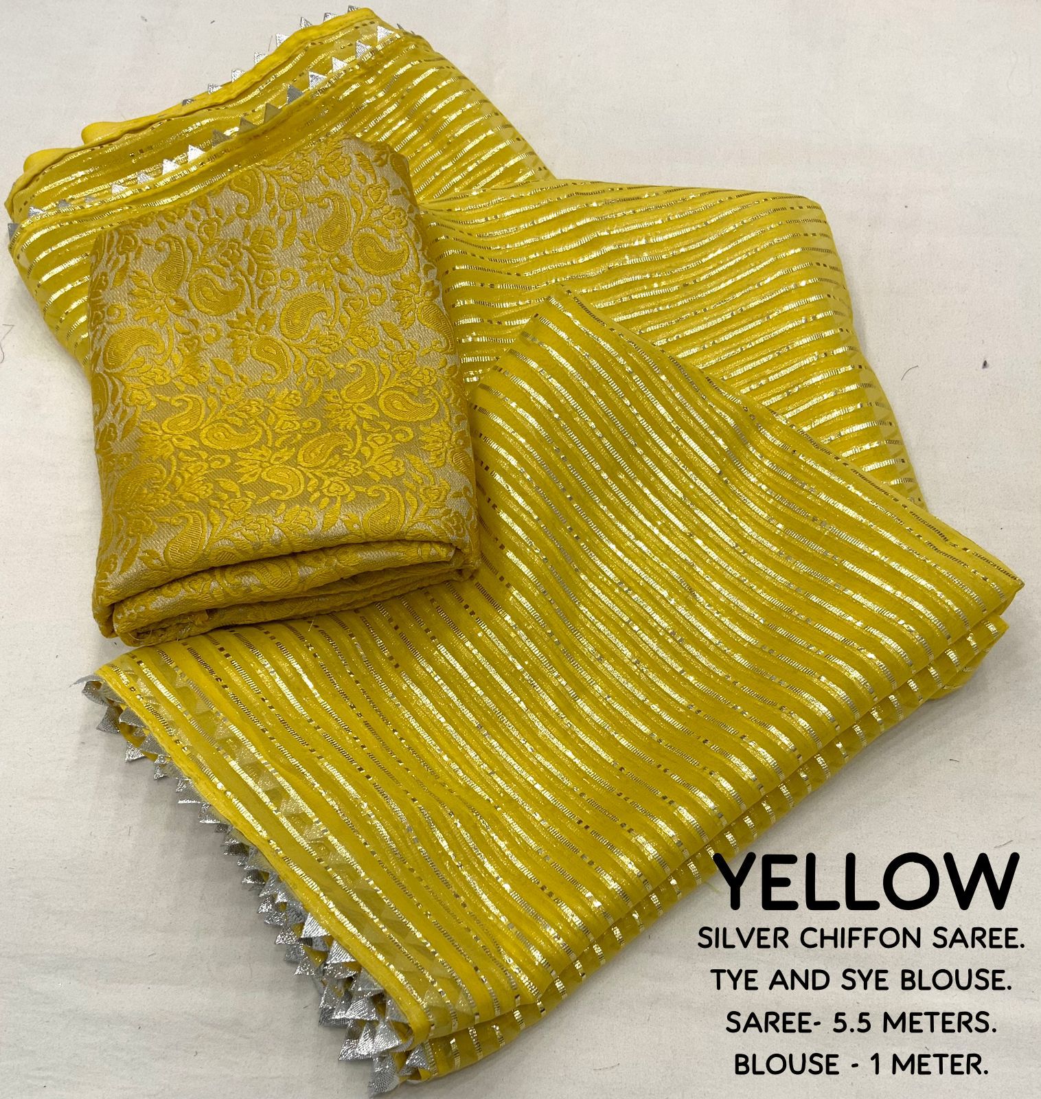 This soft chiffon saree captures the essence of understated elegance with its delicate silver zari weaving lines running gracefully throughout the fabric. The design is elevated by a traditional gota temple border, adding a timeless touch to its contemporary appeal. Paired with a ton-to-ton dye and dye Banarasi silk blouse, this ensemble offers a perfect harmony of texture and color. The saree measures 5.5 meters, with a 1-meter blouse piece, making it an ideal choice for festive gatherings, weddings, and cultural celebrations.
