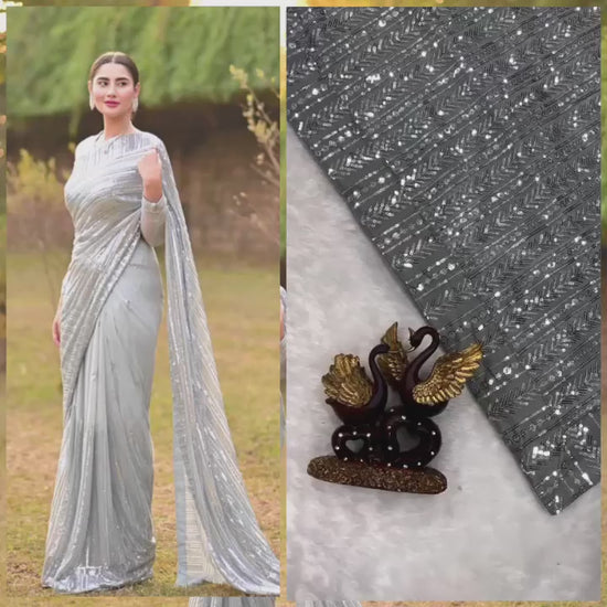 This women’s saree is crafted from soft georgette, featuring intricate double run sequins embroidery that brings a subtle shimmer to its graceful drape. A delicate sequins lace border frames the saree, enhancing its refined look. The set includes a blouse made from heavy georgette and banglori fabric, providing a structured, elegant finish. Designed for festive occasions, weddings, and special gatherings, this saree blends modern embellishment with traditional style for a timeless appeal.