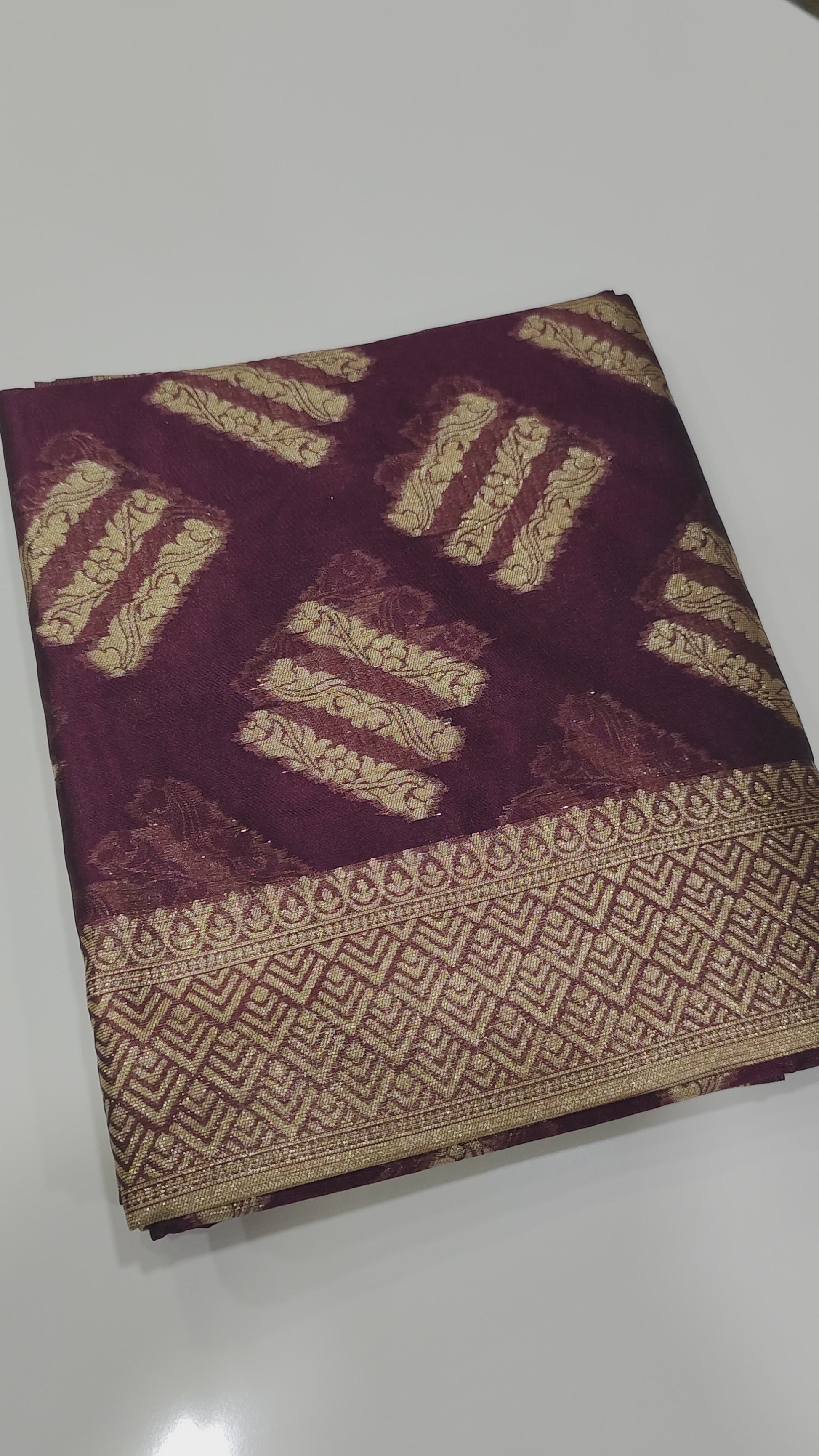Organza Silk Zari Weaving Saree with Golden Butties, Silver Zari Pallu & Brocade Blouse