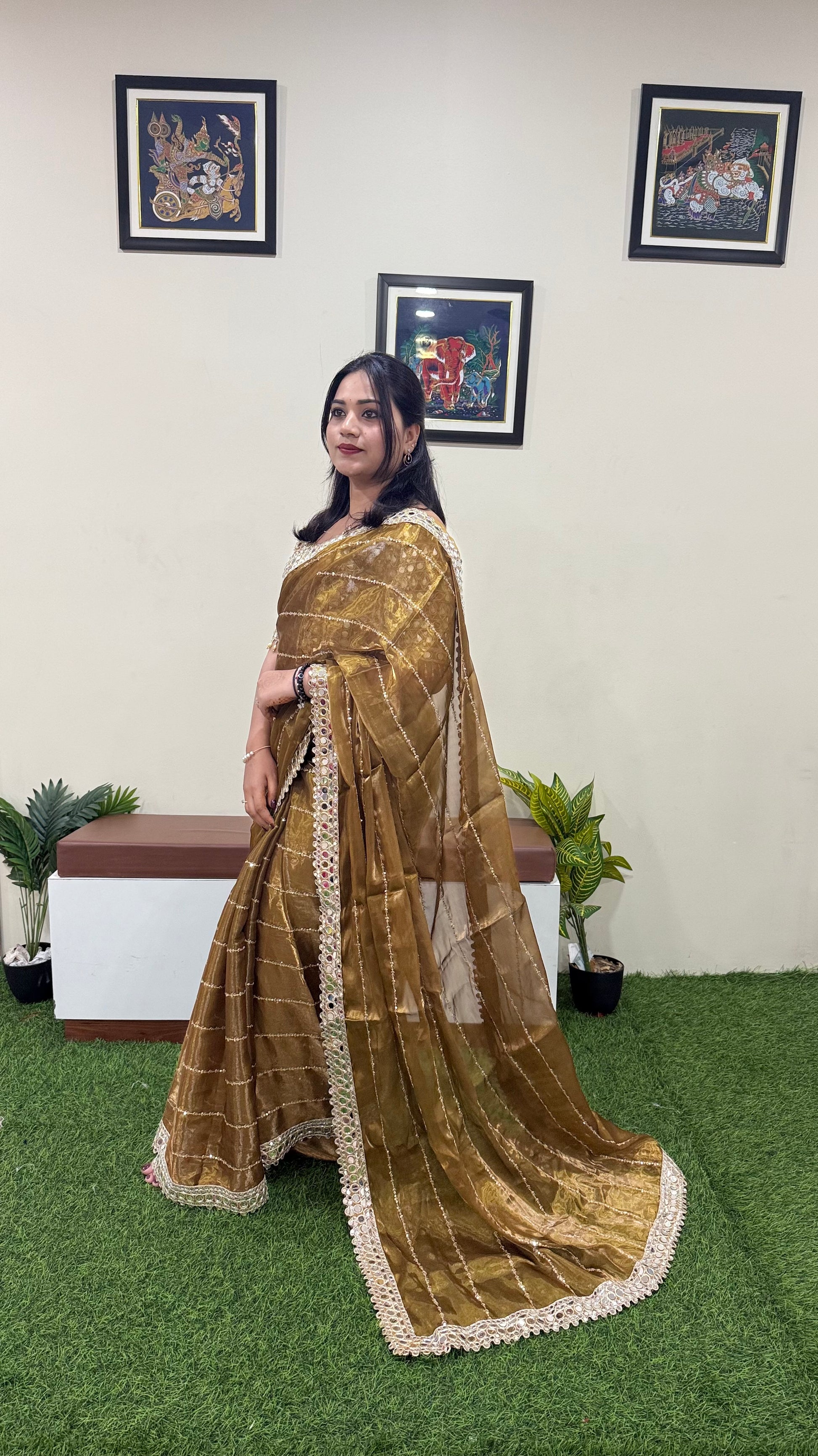 This soft satin organza saree is a graceful ensemble crafted for festive occasions, celebrations, and cultural gatherings. Known for its lightweight texture and elegant fall, the soft satin organza fabric enhances the drape, creating a refined and sophisticated look. Highlighted with real mirror work embroidery along the borders, the saree reflects timeless artistry, bringing a balance of tradition and modern elegance.