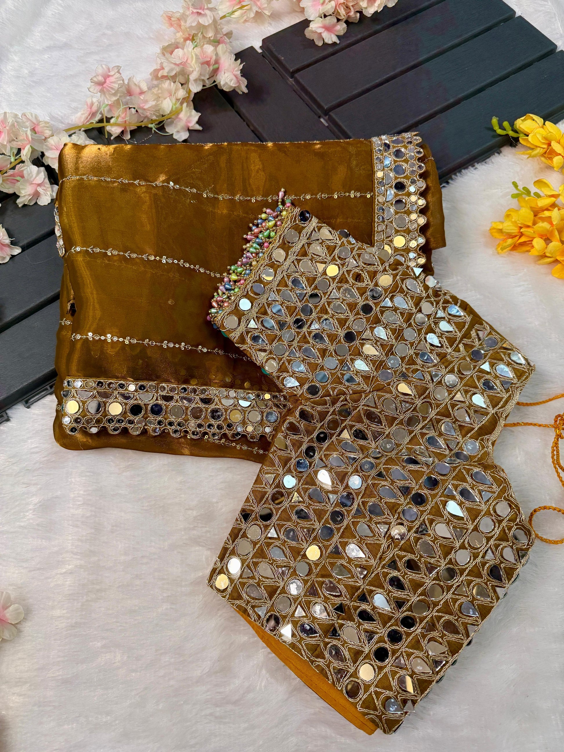 Soft Satin Organza Saree with Real Mirror Work Embroidery and Stitched Blouse – Festive Wear for Women