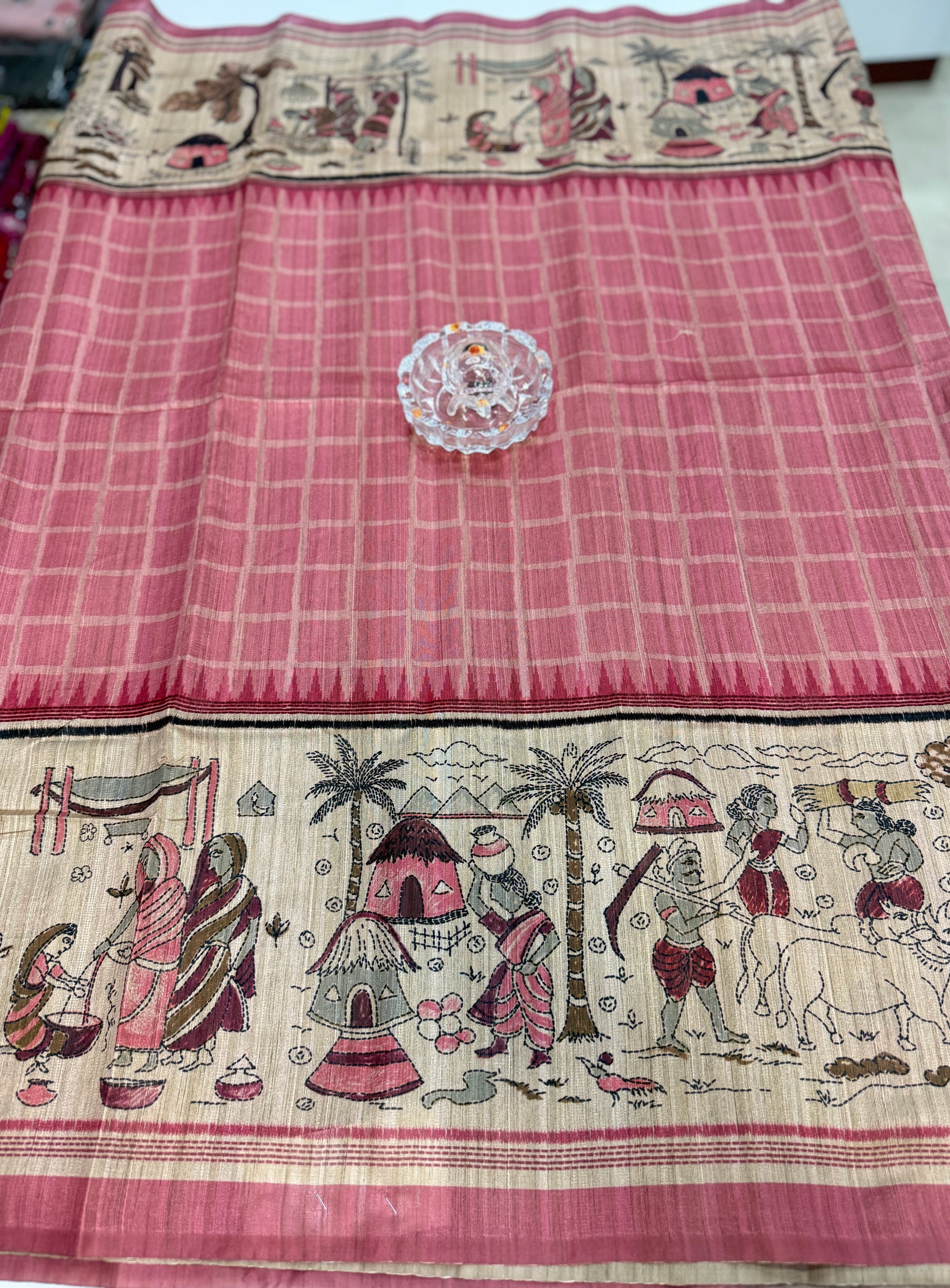 Spider Silk Saree with Folk Art Print Border and Tassel Pallu