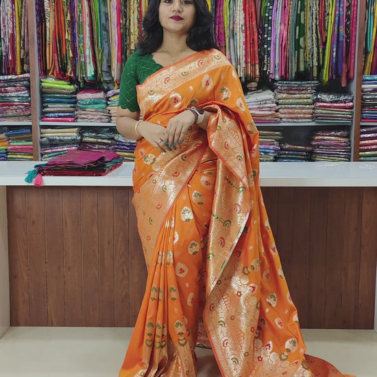 Embrace timeless tradition with this Banarasi silk saree, crafted using authentic weaving techniques from Banaras. The saree features a lustrous silk base adorned with detailed woven motifs and classic Banarasi patterns, offering a blend of cultural richness and modern elegance. Its smooth drape and luxurious texture make it a perfect choice for weddings, festive occasions, and cultural celebrations.