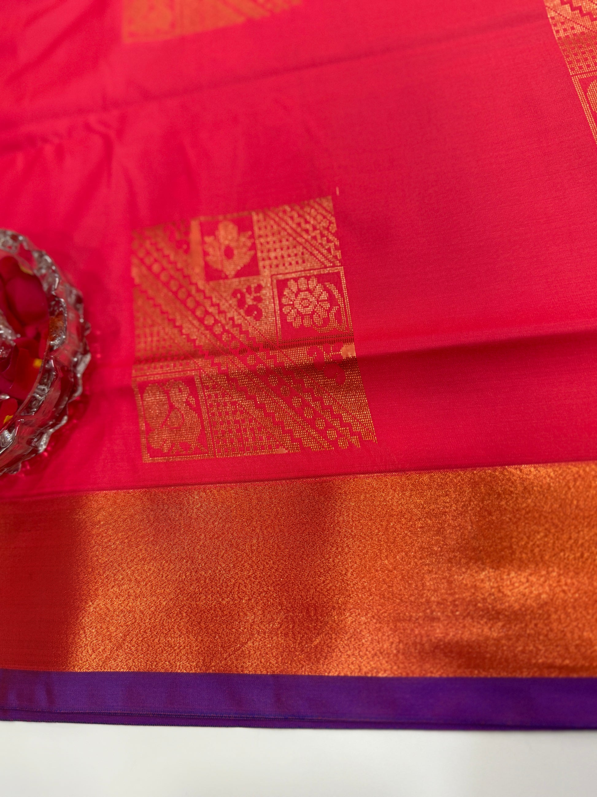 The Kanchi Soft Silk Saree is a refined showcase of South Indian weaving artistry, blending tradition with sophistication. Crafted from premium soft silk, it offers a smooth, lustrous texture that drapes gracefully, ensuring comfort while maintaining regal elegance.