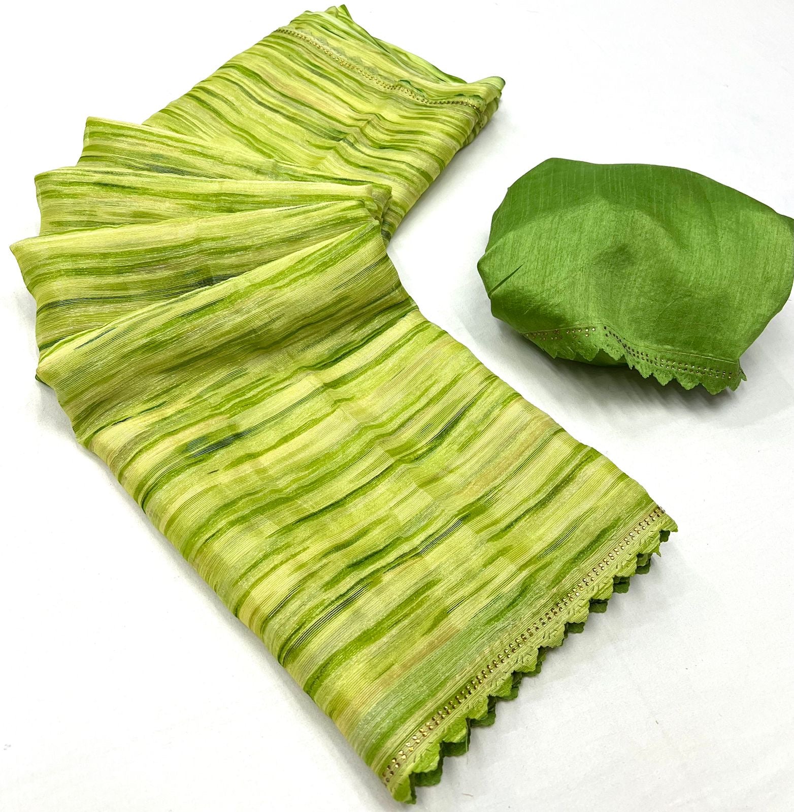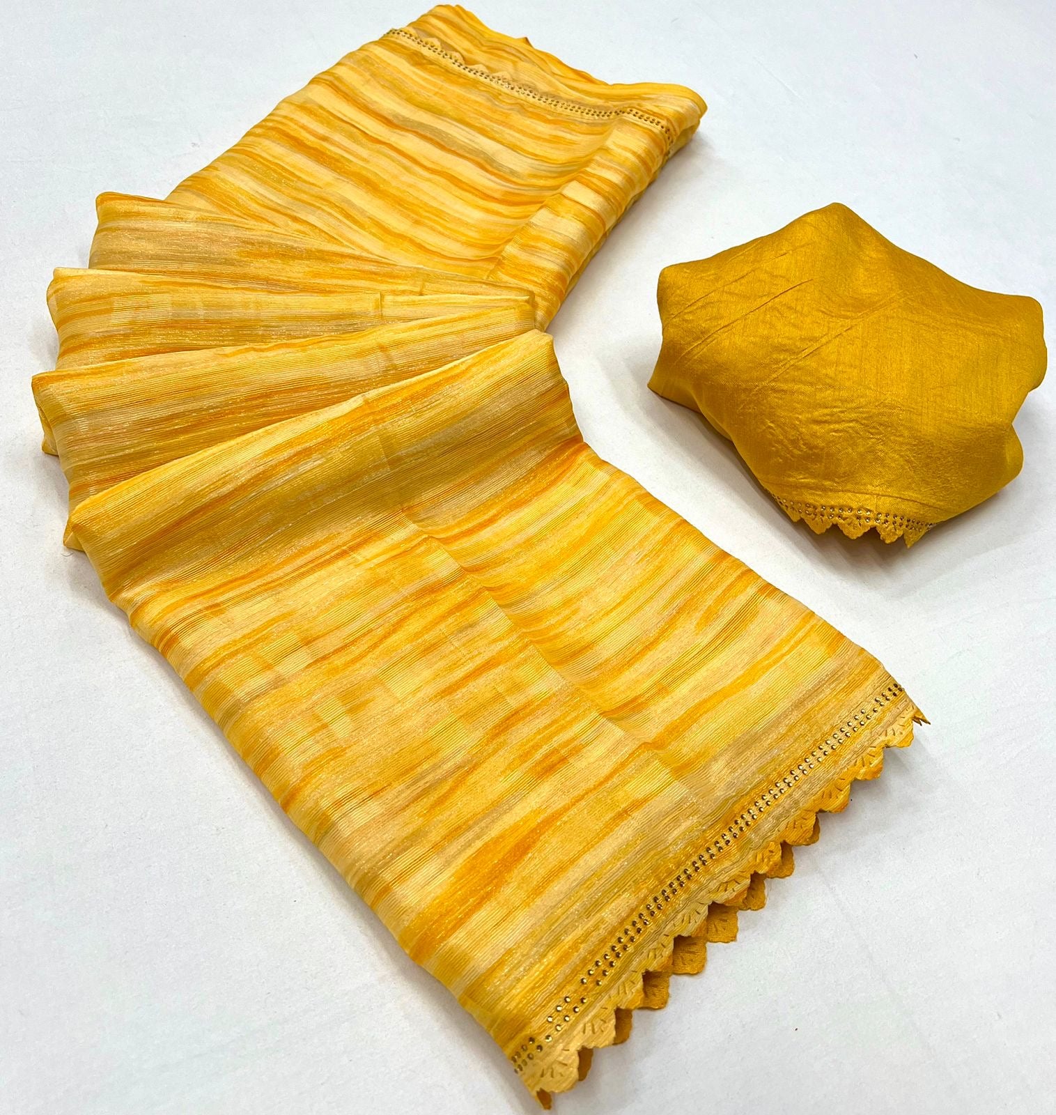 Elevate your wardrobe with our exquisite Gold Georgette saree, featuring a sophisticated weaving zari sibori print. This elegant saree is adorned with a Siroski cutwork border that adds a touch of luxury and refinement. Paired with a Siroski cutwork art silk blouse, this ensemble is perfect for any special occasion.