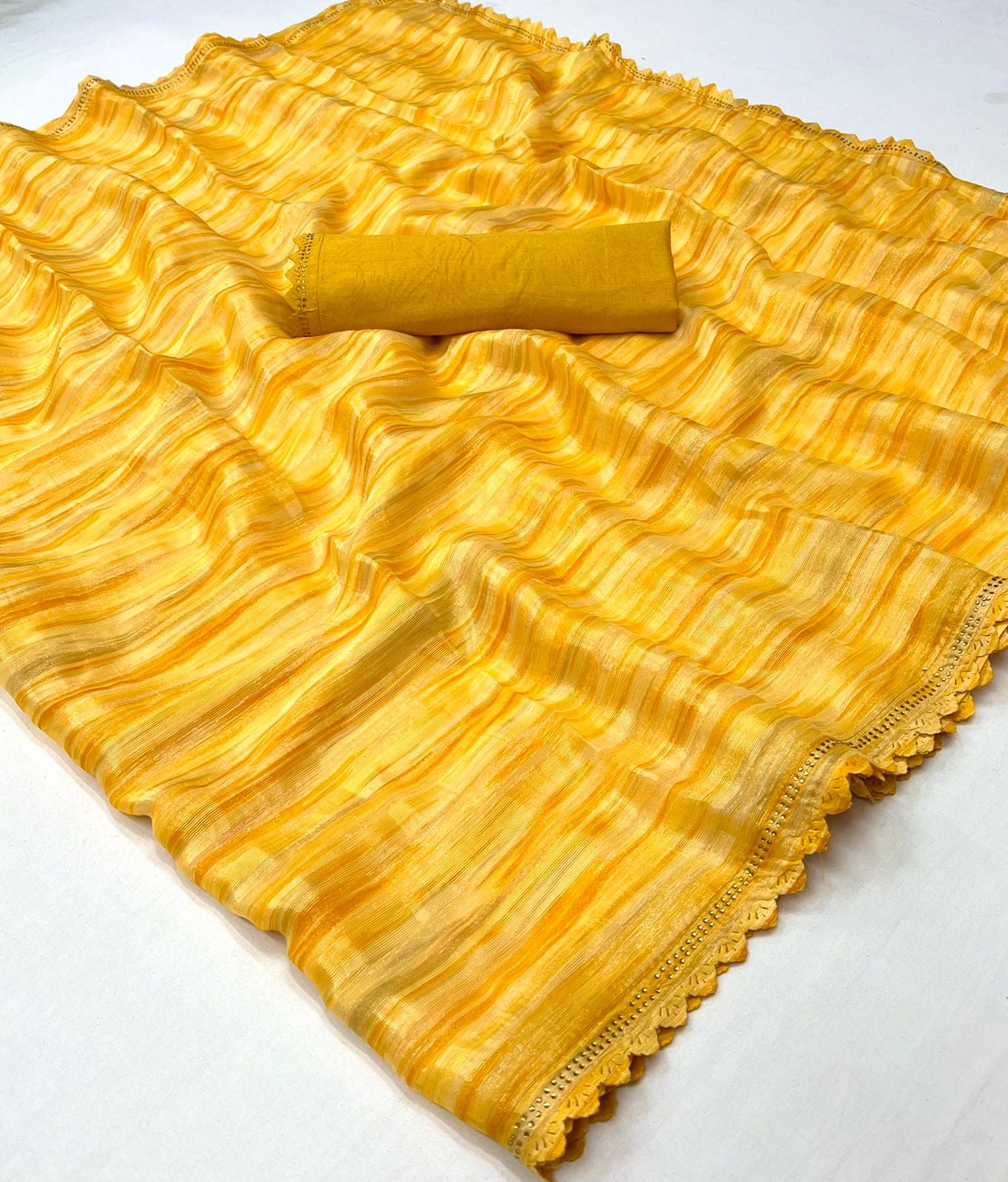 Stunning Gold Georgette Saree with Weaving Zari Sibori Print and Siroski Cutwork Border