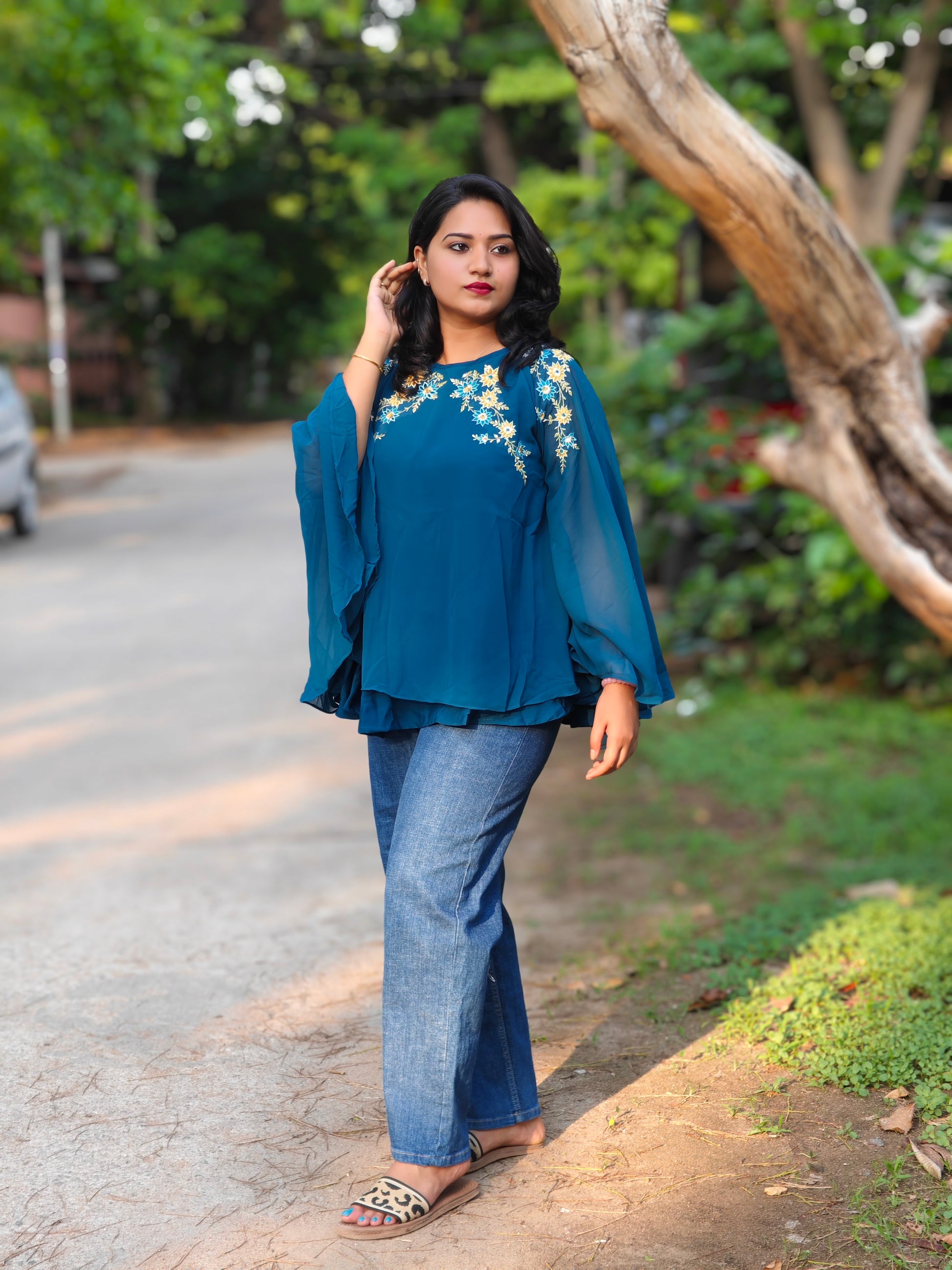 This teal blue georgette embellished A-line top is a versatile piece that combines elegance with comfort, making it suitable for both casual and semi-formal wear. Crafted from lightweight georgette, it features delicate floral embroidery along the neckline and shoulders, adding a refined touch to its flowy silhouette. The layered hemline creates graceful movement, while the relaxed A-line cut ensures comfort across all sizes from S to 3XL. Fully stitched and easy to pair with jeans, trousers, or skirts, this top is ideal for day outings, festive gatherings, or office wear.
