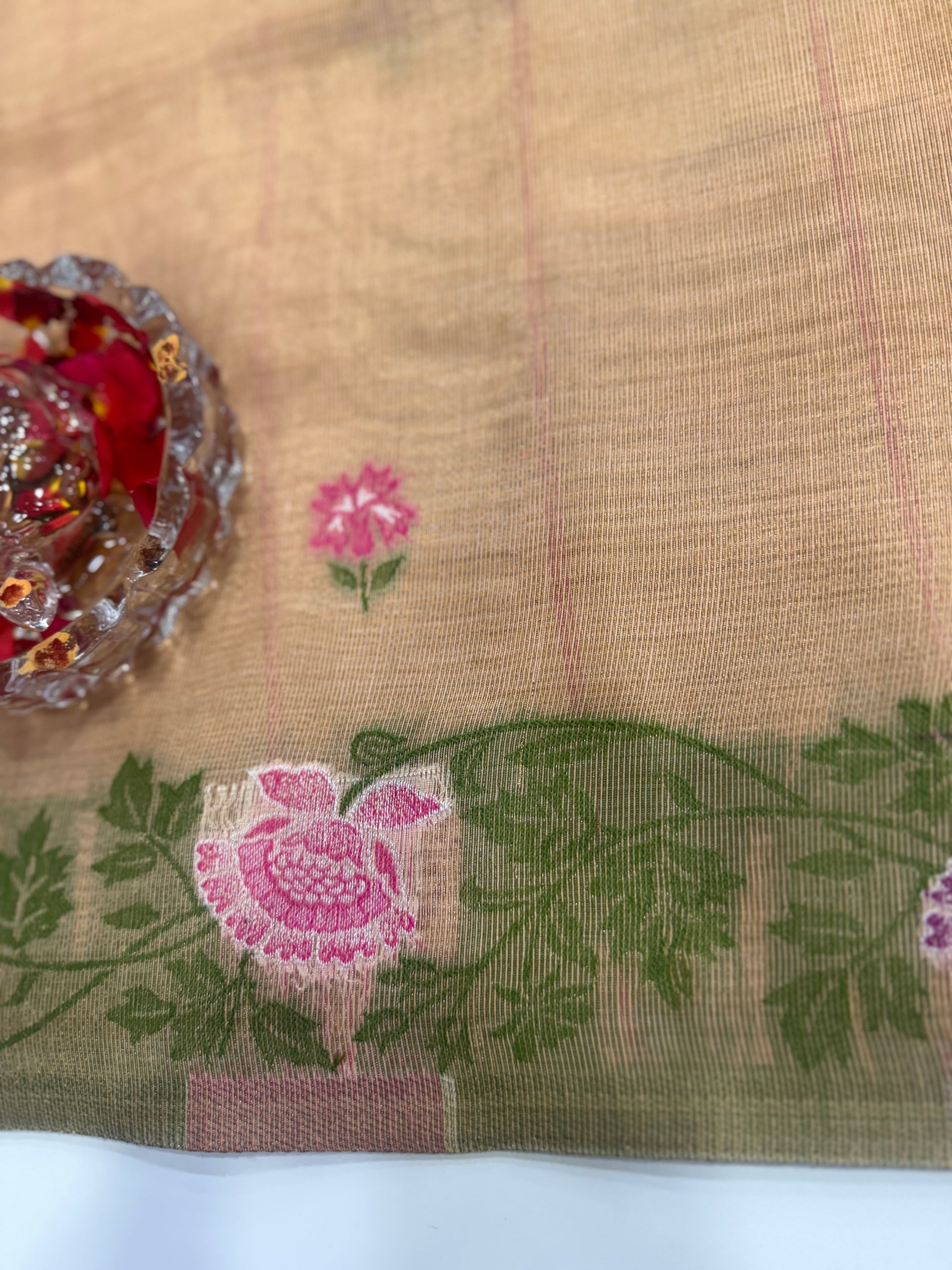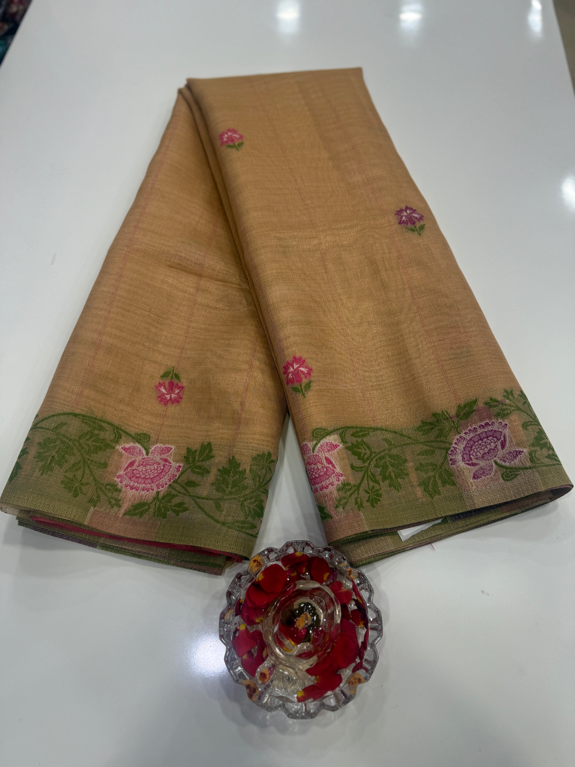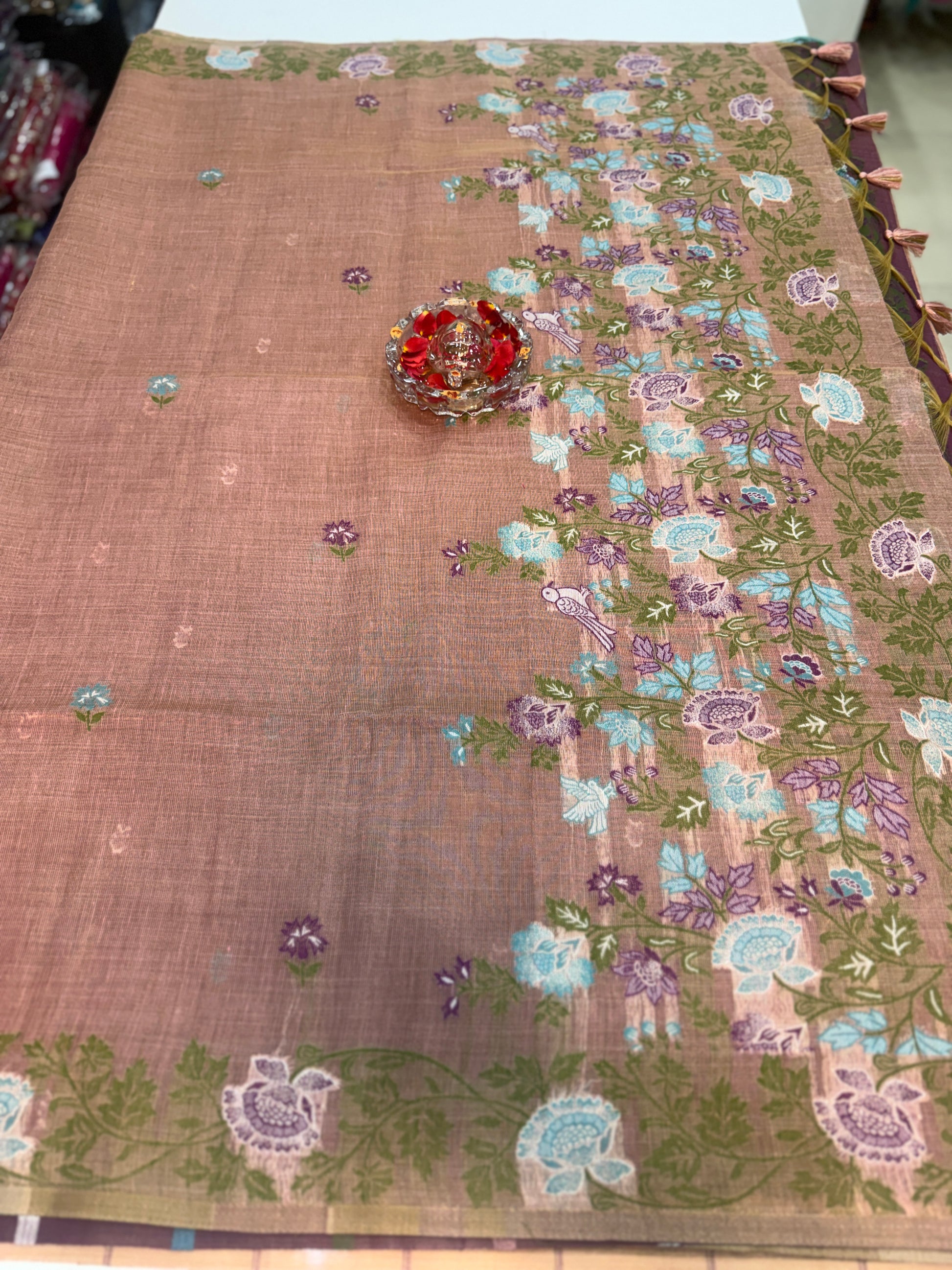Tissue chanderi saree with floral border and tassel pallu, pastel printed saree for women
