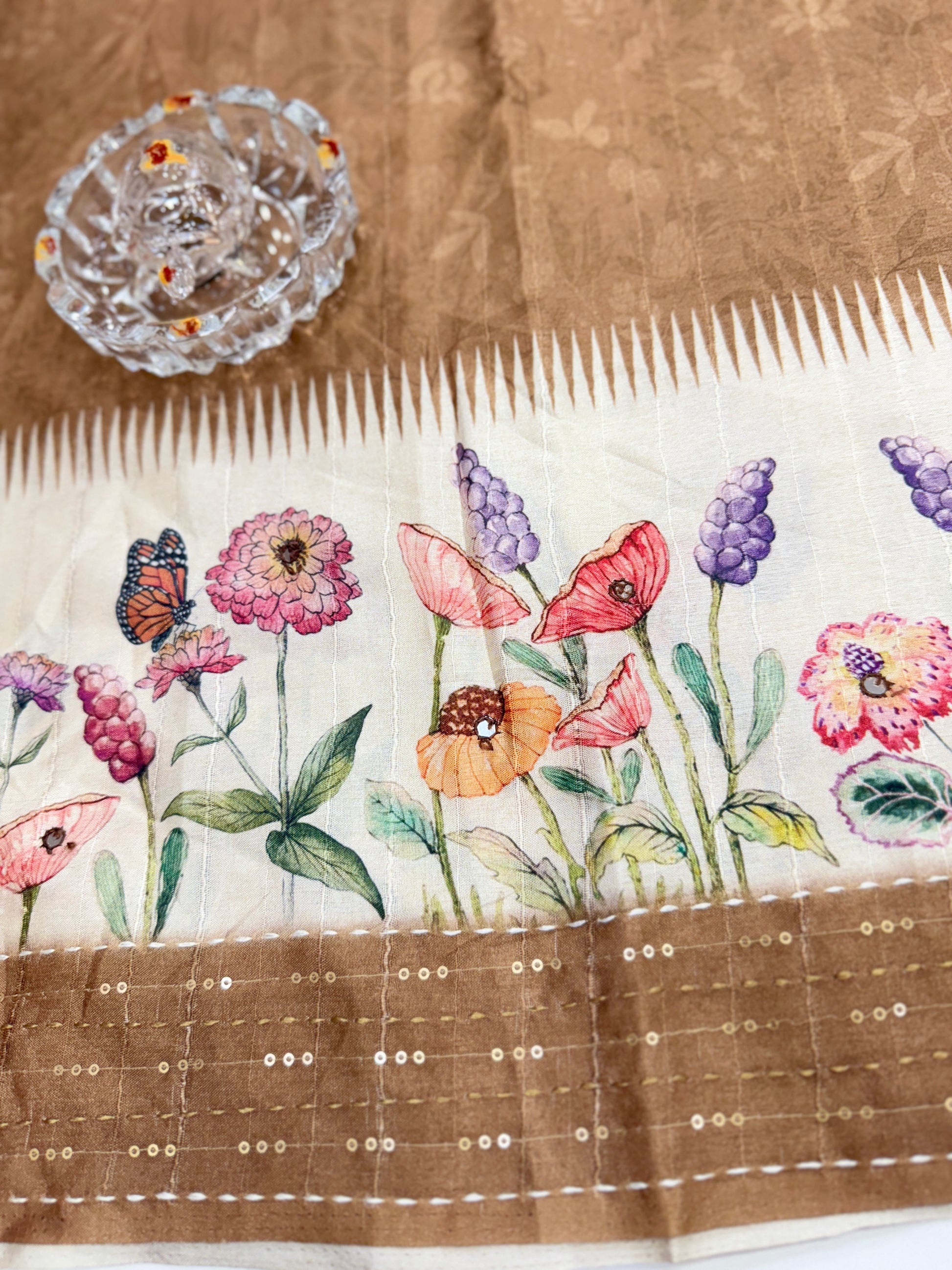 This designer saree is crafted from soft tussar fabric, detailed with katha-style printed borders and delicate mirror work across the drape. The saree combines traditional artistry with modern prints, offering motifs such as Radha Krishna scenes and floral vines that bring cultural richness to the look.