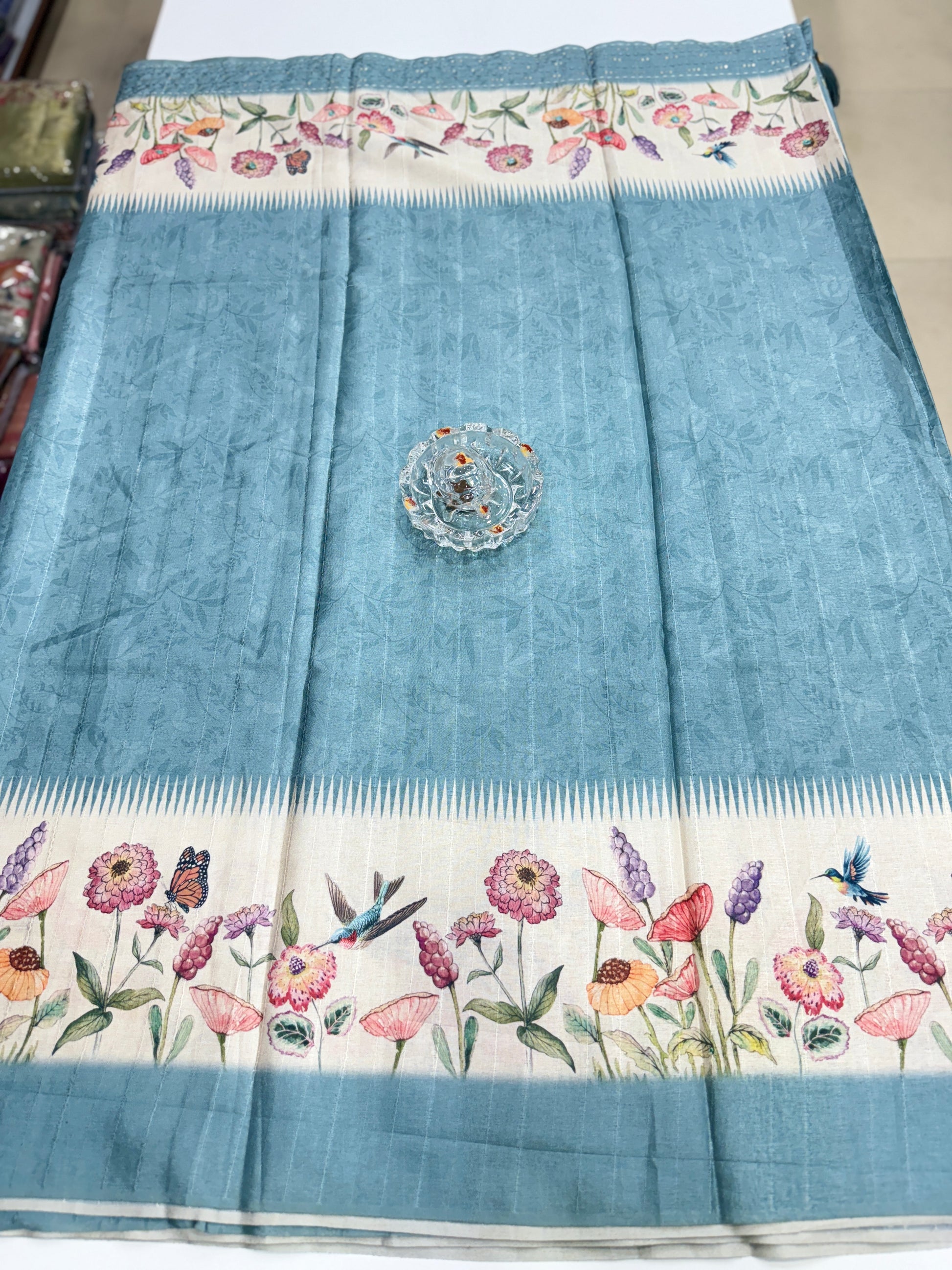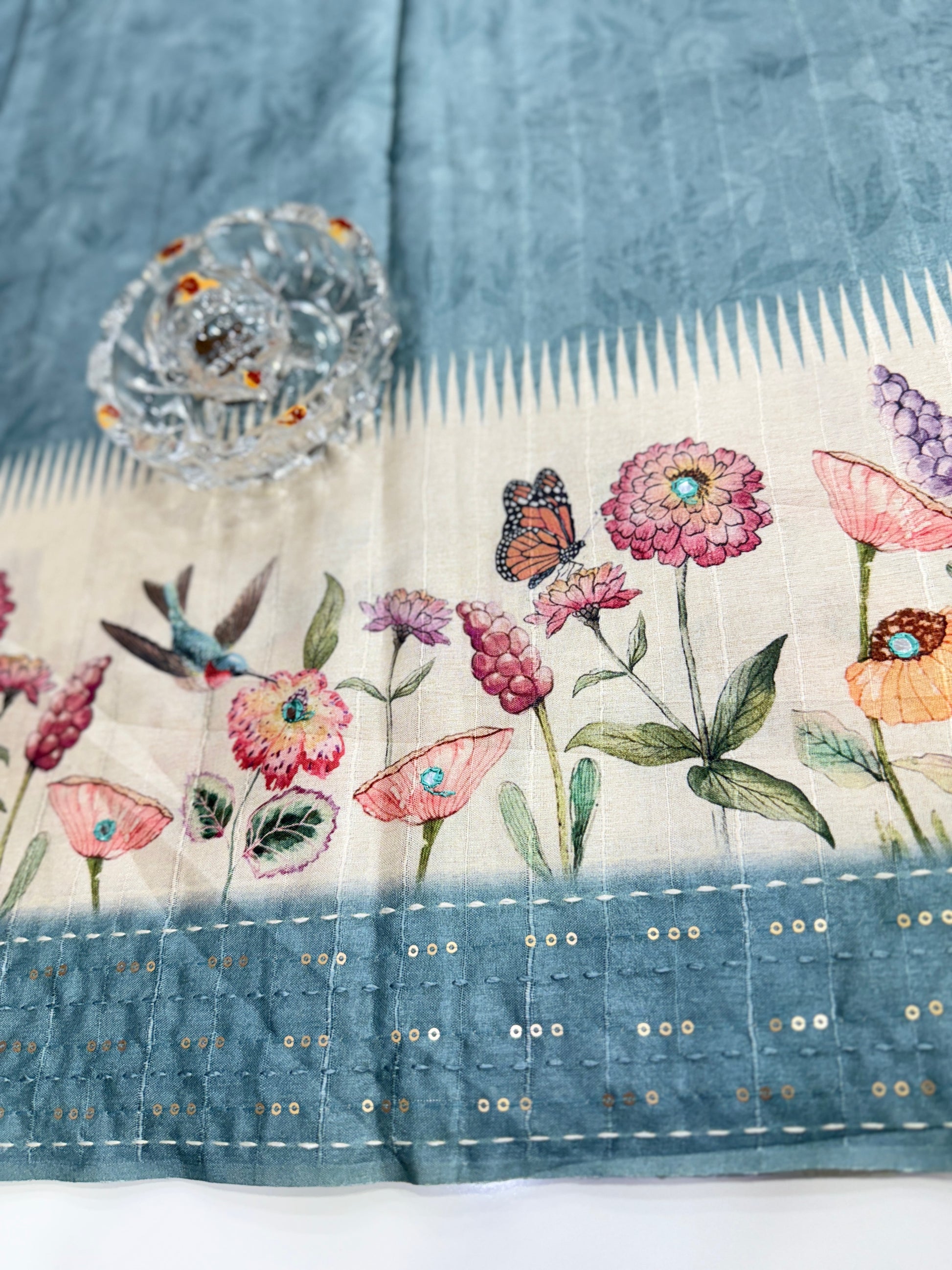 This designer saree is crafted from soft tussar fabric, detailed with katha-style printed borders and delicate mirror work across the drape. The saree combines traditional artistry with modern prints, offering motifs such as Radha Krishna scenes and floral vines that bring cultural richness to the look.