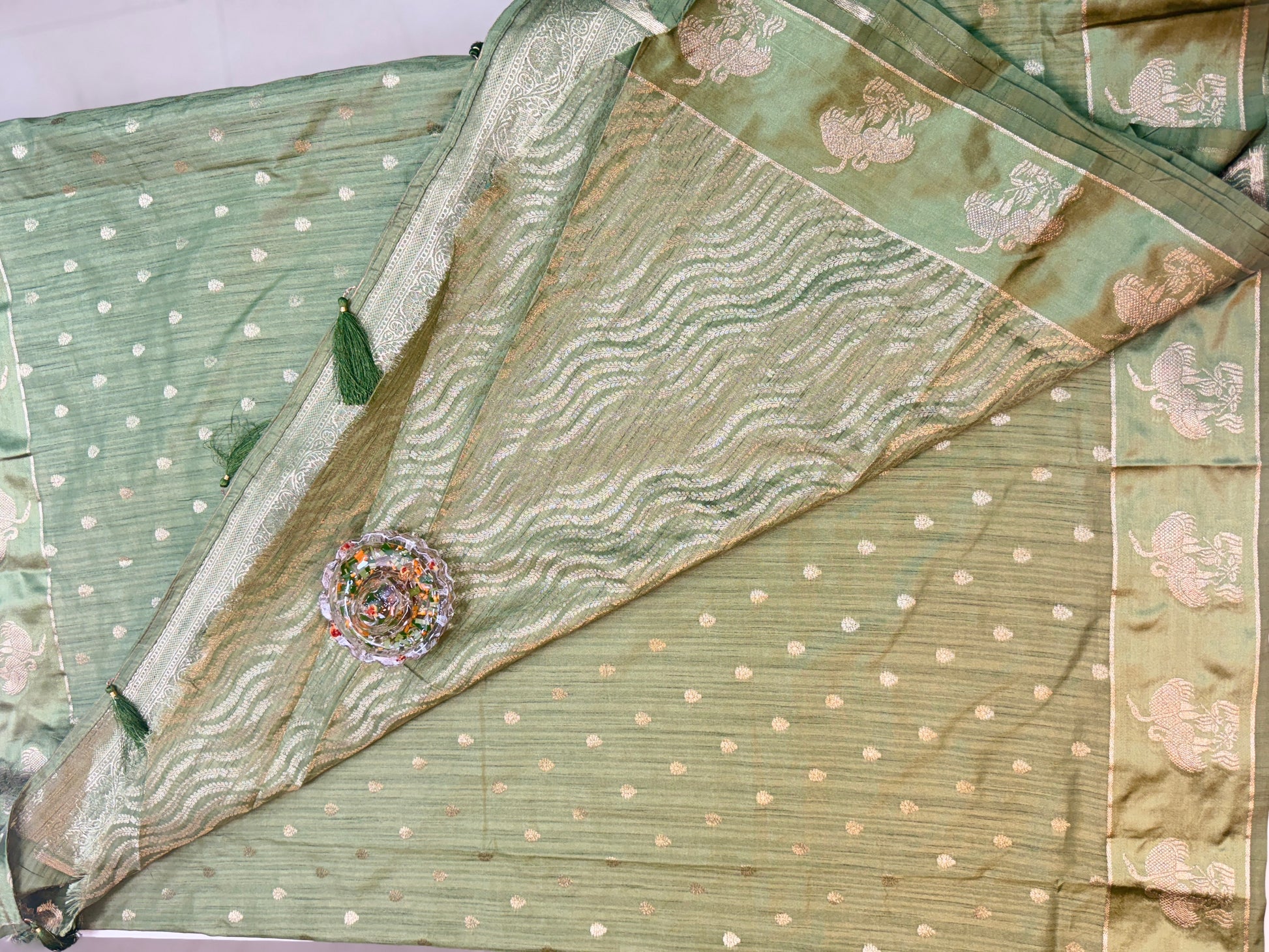 This Tussar silk saree with satin border combines the richness of tussar texture with the sheen of satin, creating a graceful drape ideal for festive and cultural occasions. Designed in vibrant shades such as pink, green, blue, mustard, beige, and purple, each saree features elegant woven motifs and a coordinating blouse piece. The satin border enhances the overall finish, offering a refined contrast that elevates the traditional look. Lightweight and versatile, this saree is well-suited for family gatherings, festive celebrations, or daily cultural wear where elegance meets comfort.