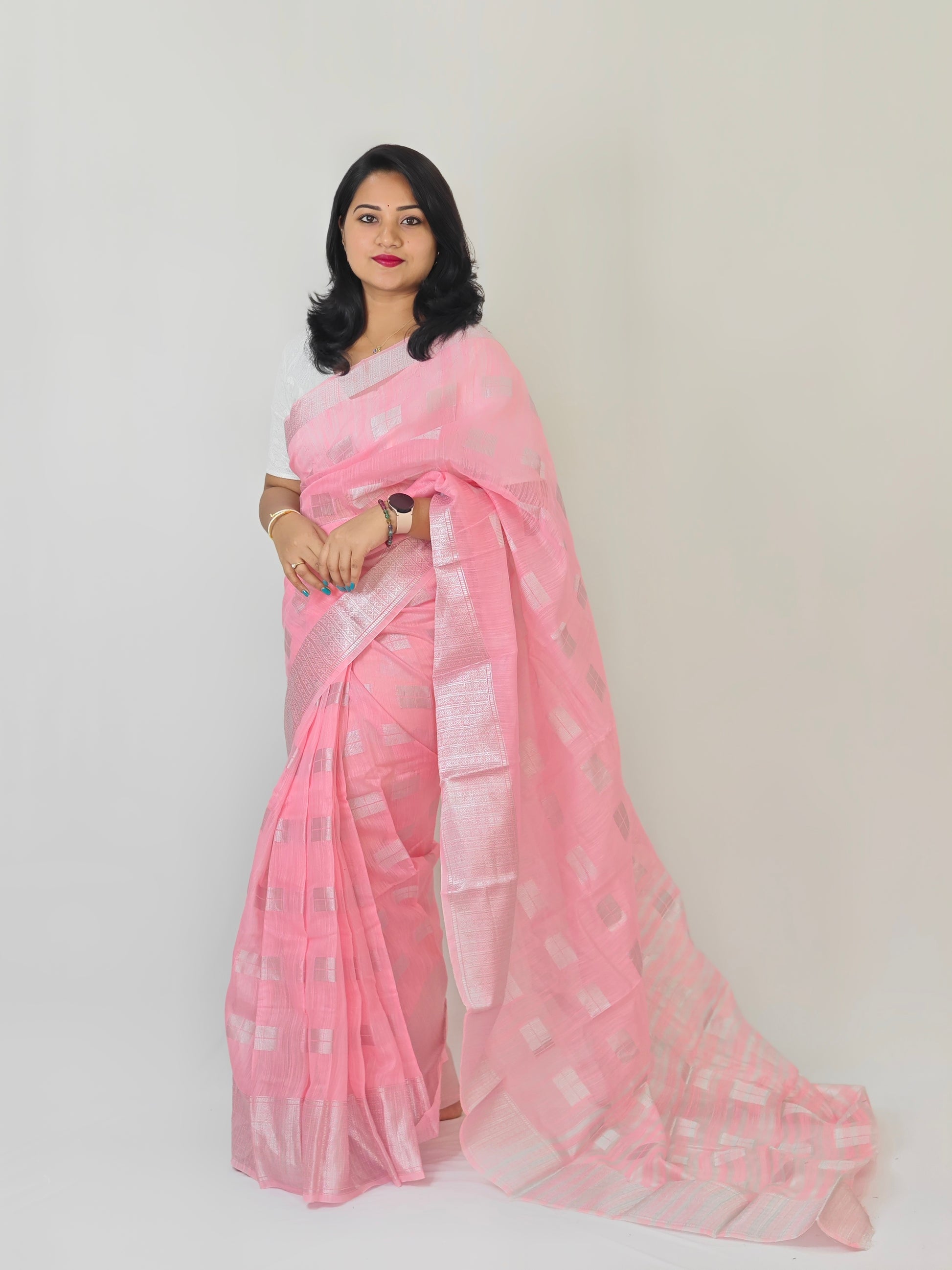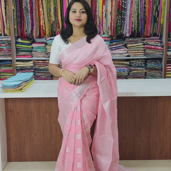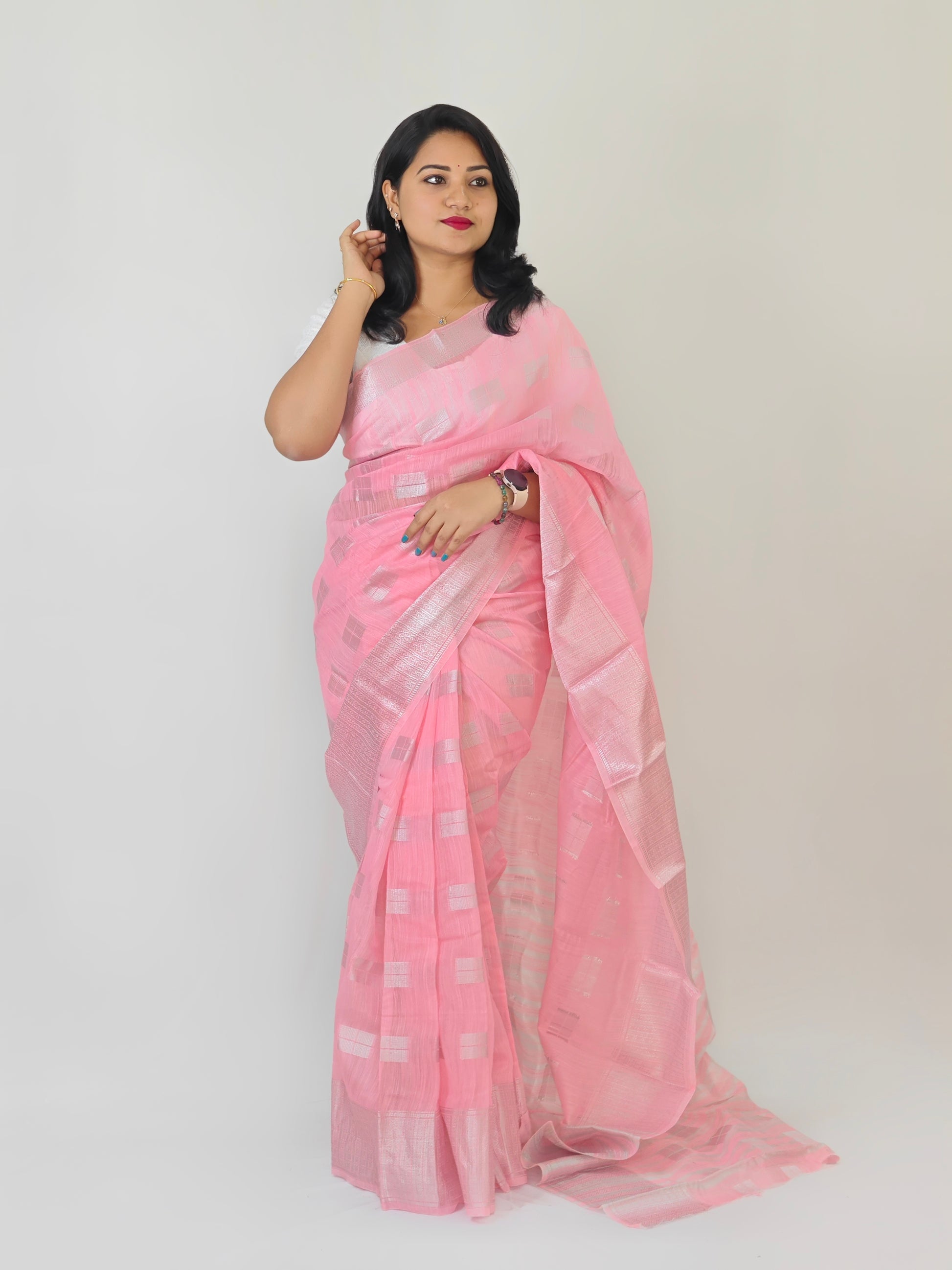 This Linen Silk Saree with Silver Zari Weaving is a refined blend of lightweight comfort and traditional artistry, designed to enhance your festive and wedding wardrobe. Crafted from premium linen silk, the fabric offers a breathable, soft feel while retaining a graceful drape.