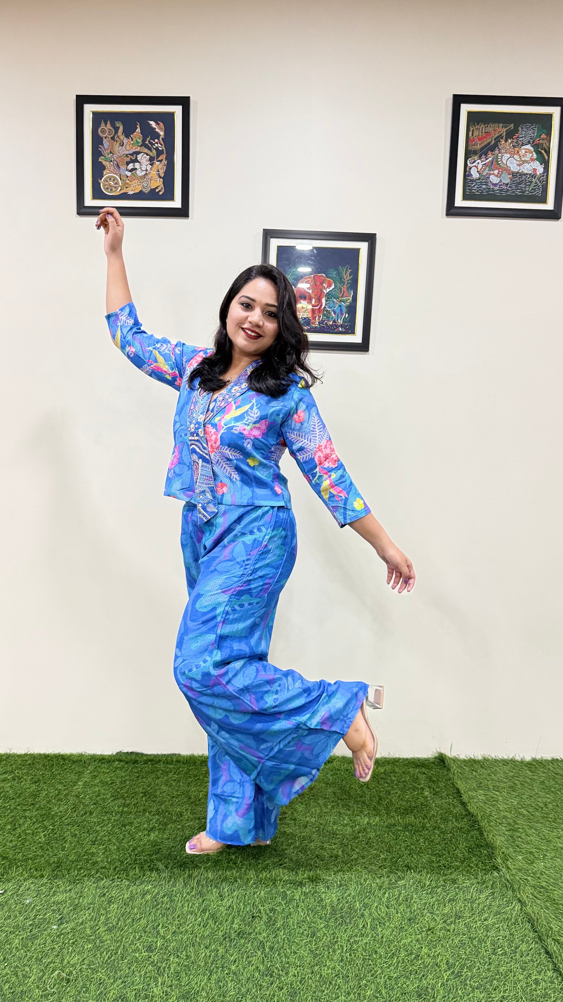 This designer crop top and divider set is crafted in pure natural crepe with a striking digital print and elevated by intricate heavy handwork. The rich finish and fluid drape make it a standout ensemble for festive gatherings, parties, or elegant occasions. Designed in a flattering fit with a coordinated divider pant, this outfit offers a bold yet graceful style statement.