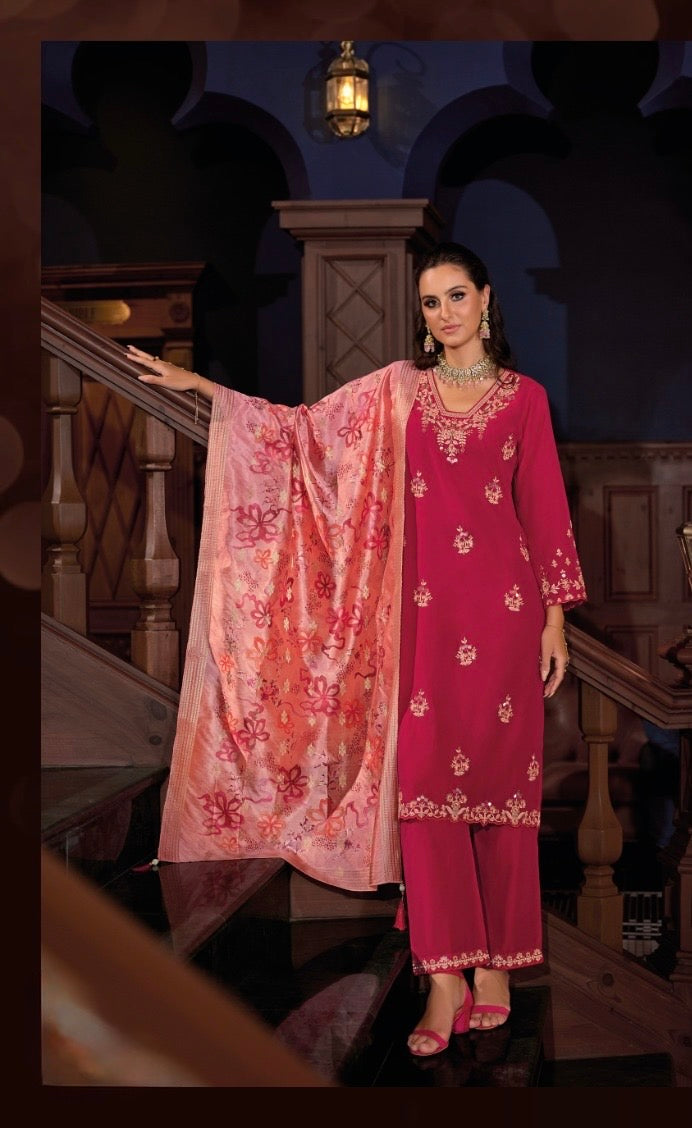 Celebrate festive elegance with this beautifully designed viscose silk 3-piece suit set. The kurta is crafted from premium viscose silk featuring delicate embroidery and mirror work on the neckline and yoke, paired with a soft lining for comfort and structure. The viscose silk plazzo is adorned with fine embroidery and includes a convenient pocket for functionality without compromising style. Completing the ensemble is a printed fancy fabric dupatta with tassel edging, offering a vibrant finish to the outfit. Designed for modern women who value traditional aesthetics with a practical touch, this suit set is an ideal choice for festive occasions, cultural events, and family gatherings. Available in XL and XXL sizes.