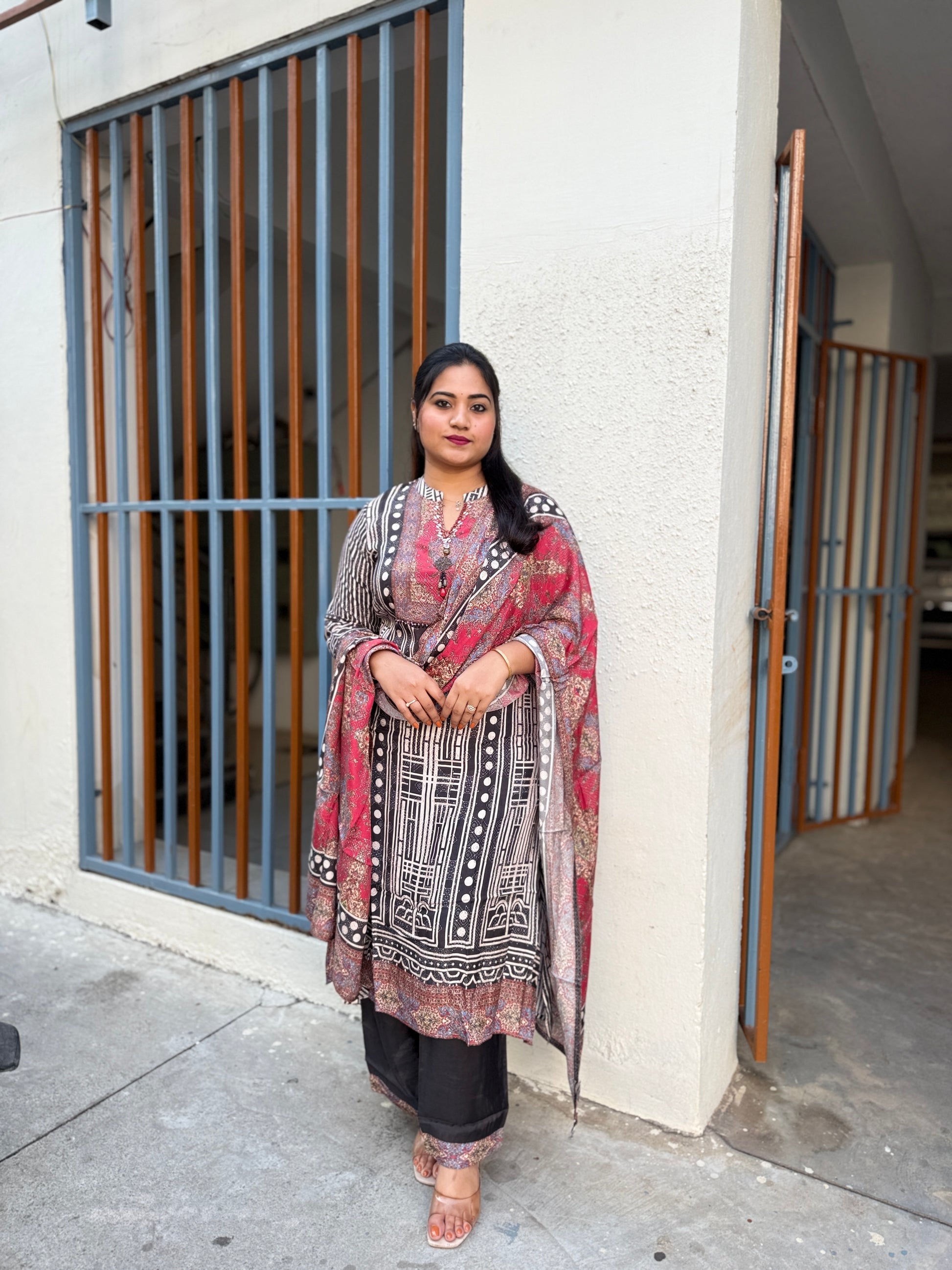 This three-piece viscose silk kurta pant dupatta set features a rich printed design inspired by traditional ethnic artwork. The kurta showcases multi-panel prints in black, red, and earthy tones, enhanced with mirror-style detailing around the neckline for a festive look. The straight-cut silhouette offers comfortable movement, while the matching printed dupatta brings visual continuity to the outfit. The pants are designed in a coordinated solid shade for a balanced appearance. Crafted from viscose silk, the set has a soft feel with a gentle sheen, making it suitable for festive gatherings, cultural functions, and elegant day wear. The breathable drape ensures comfort through extended wear, while the artisanal print elements add depth and character.