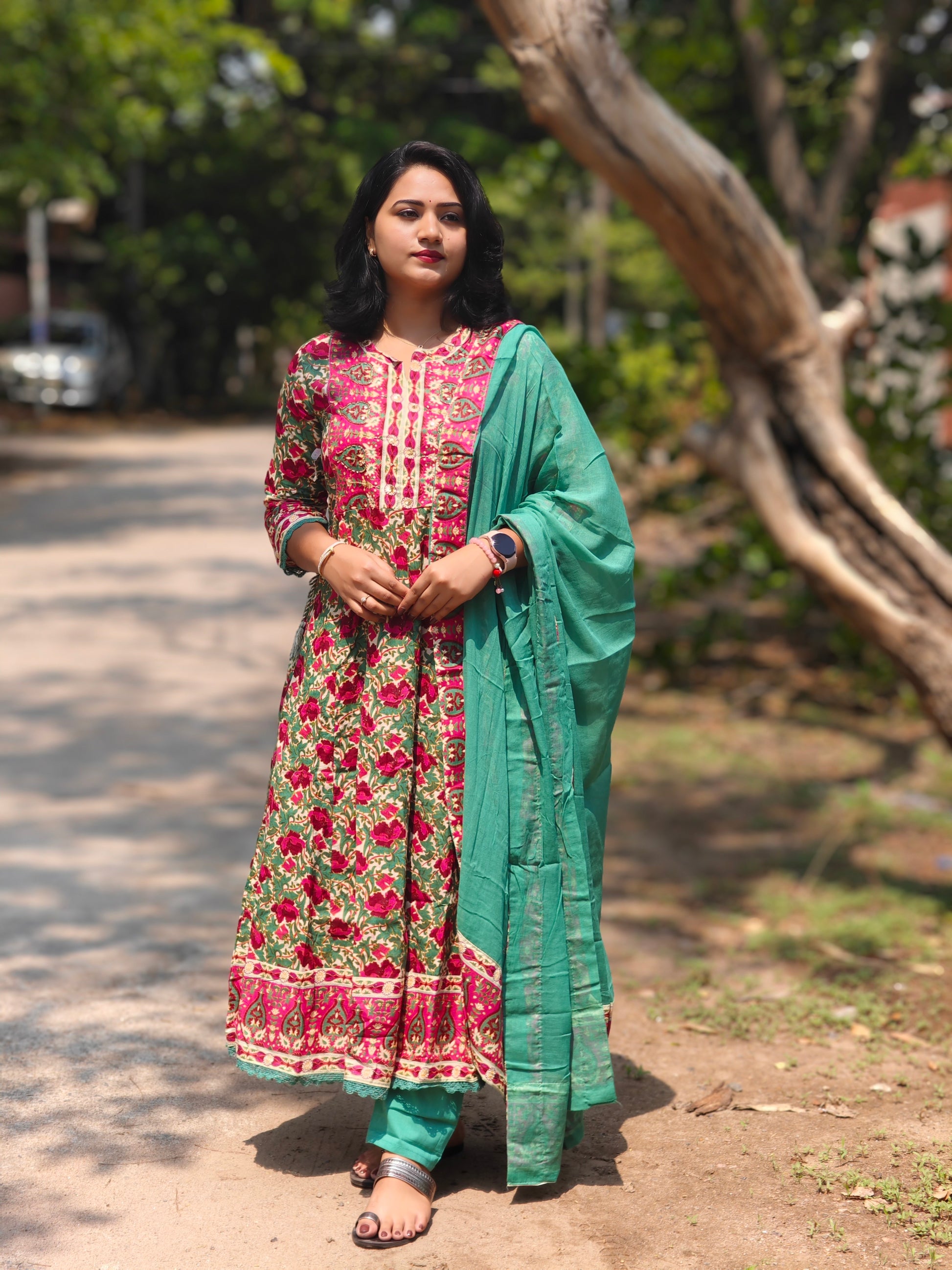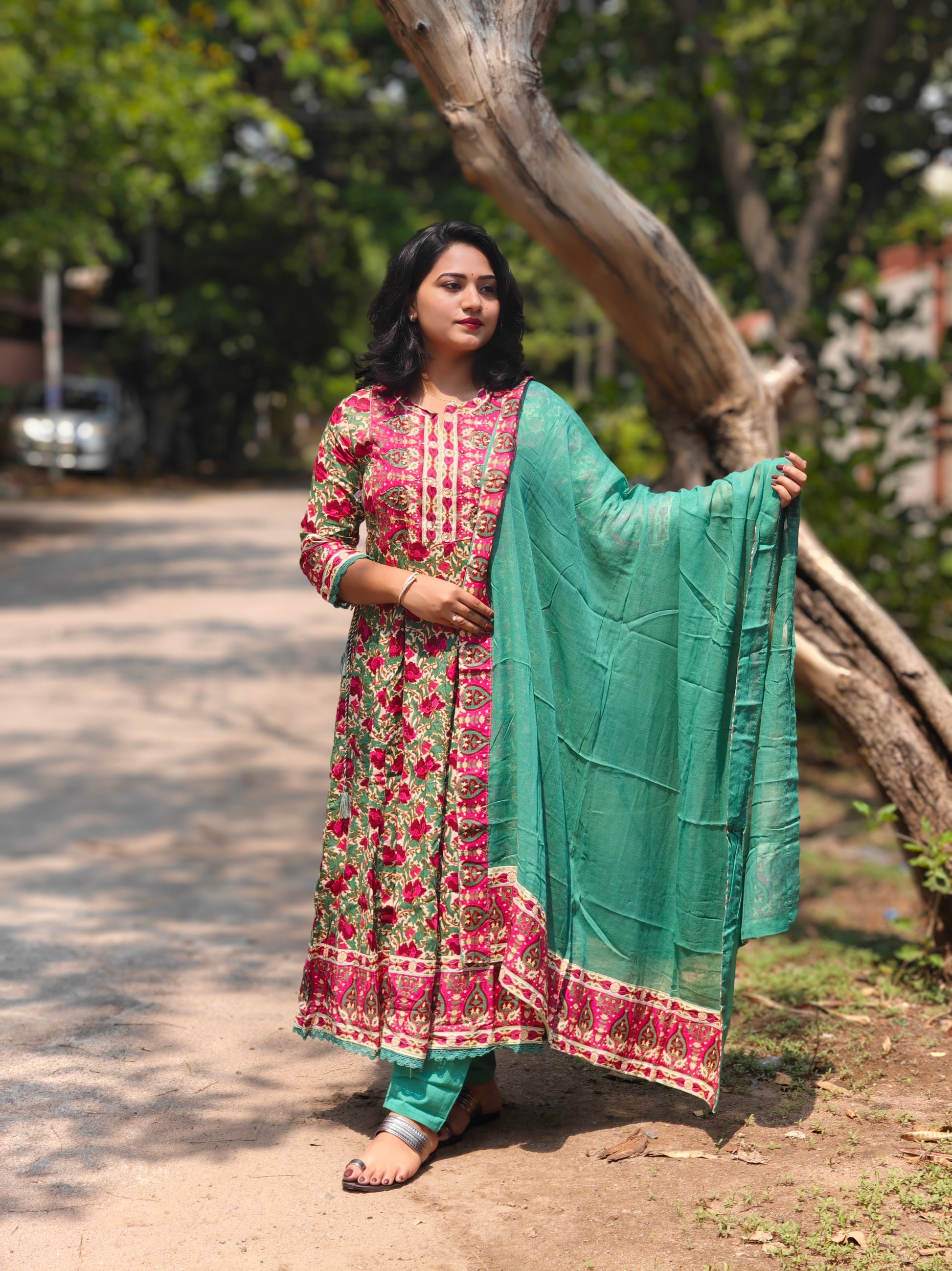This voluminous Anarkali suit set is a showcase of intricate craftsmanship, blending traditional detailing with premium comfort. Made from pure cotton 60x60 fabric, the kurta features exquisite hand embroidery, delicate zari weaving, and elegant printed patterns. The set includes matching pants and a pure mill print cotton dupatta with lace edging, adding a graceful finish. Available in sizes M and 2XL, this 3-piece ensemble is ideal for festive occasions, cultural events, and special gatherings.