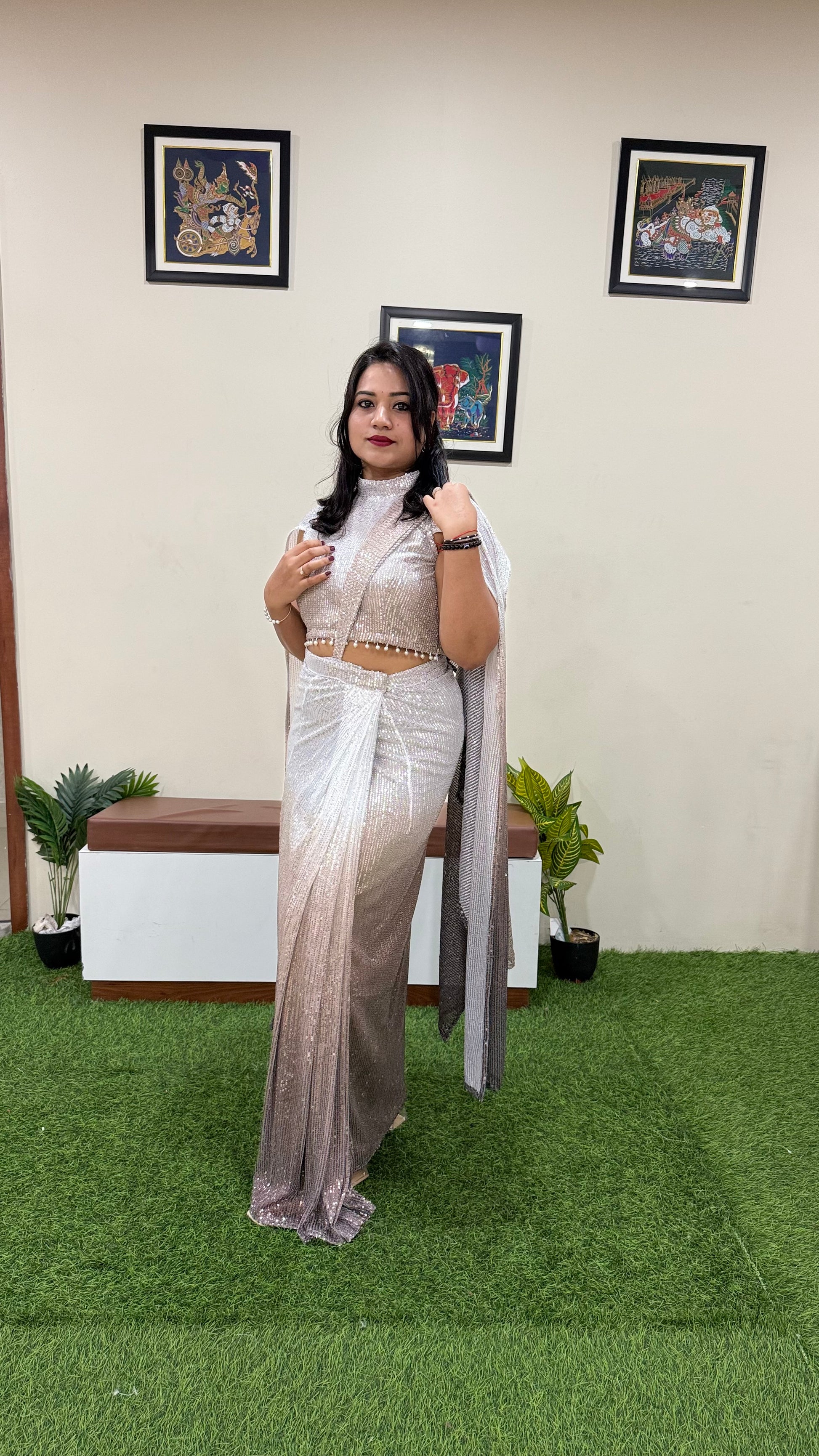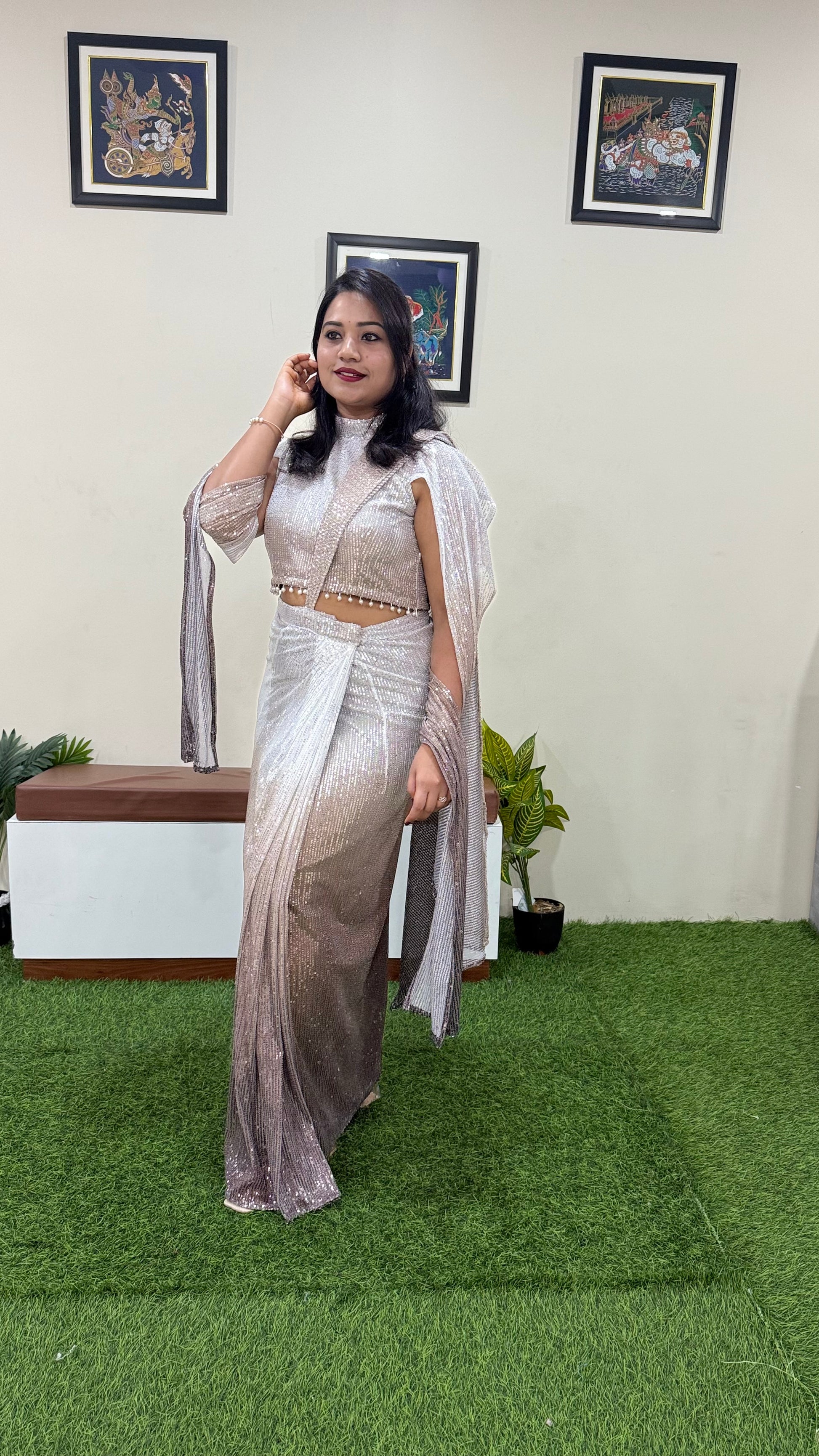 This ombre lehenga saree is a contemporary ethnic ensemble crafted to bring glamour and elegance to special occasions. Designed in premium power net fabric, it features sequin embellishments that add a refined shimmer to every drape. The lehenga saree is paired with a matching blouse tailored with stylish elephant sleeves, creating a statement silhouette perfect for weddings, festive events, and evening parties. With its ready-to-wear stitched finish, this outfit combines the richness of traditional craftsmanship with a modern ombre design that appeals to women looking for fashionable yet elegant attire.