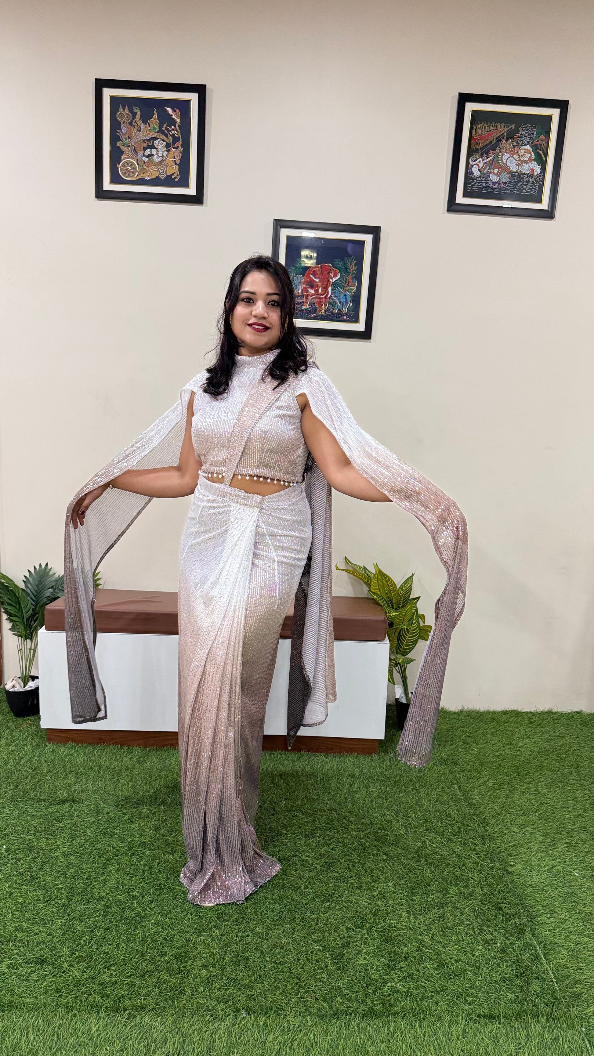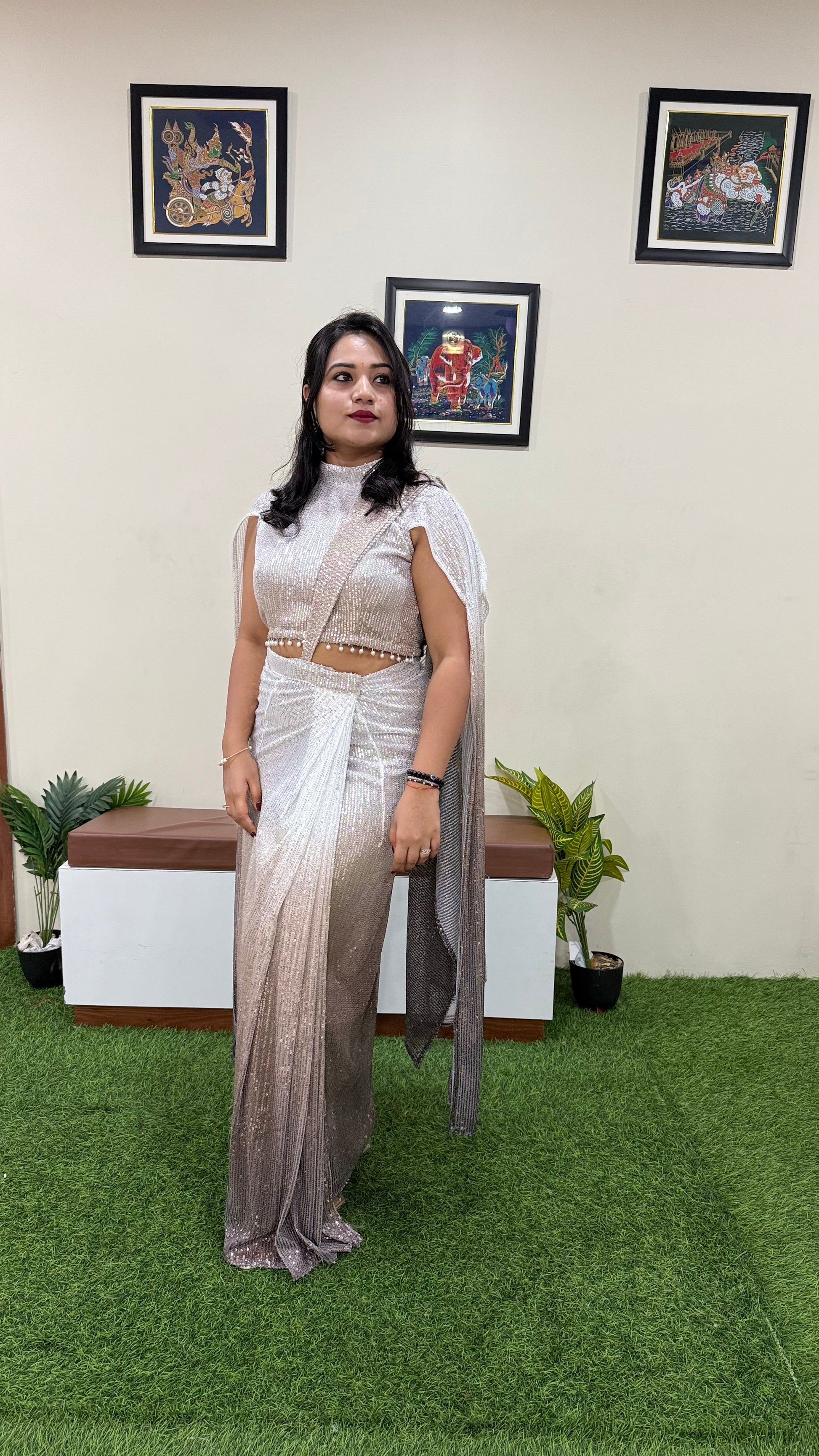 The skirt is crafted with a graceful flare and finished at 42 inches in length for a floor-grazing appeal. The blouse is designed at 14–15 inches in length, striking a balance between contemporary styling and traditional grace. Available in sizes ranging from 38 to 46, this lehenga saree ensures a comfortable fit while retaining its regal charm. The ombre color transition, combined with intricate sequin work across the fabric, enhances its festive appeal, making it an ideal choice for receptions, sangeet nights, and grand celebrations. The blouse’s elephant sleeve design adds sophistication and uniqueness, complementing the modern saree-drape effect of the lehenga. This ensemble is tailored for women who seek versatility in ethnic wear, offering a bold and glamorous option for their festive wardrobe.