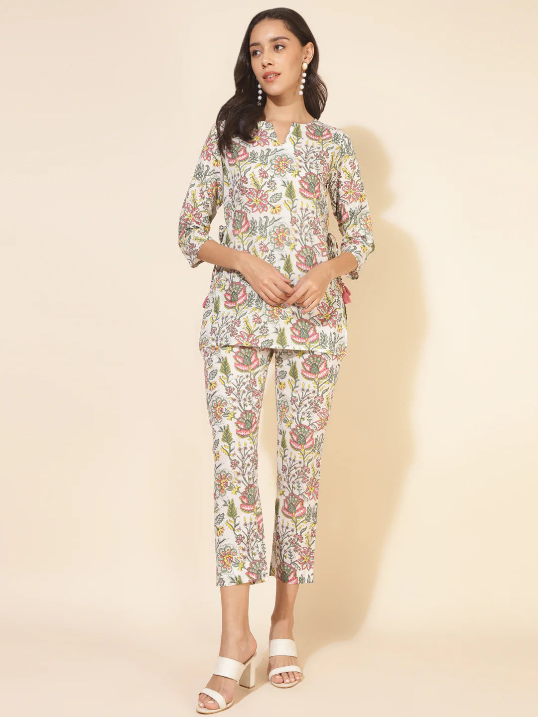 This elegant cotton co-ord set offers a blend of effortless style and comfort, ideal for everyday casual wear. The top is designed with a hip-length silhouette, notch neckline, and 3/4th sleeves for a flattering fit. Crafted from breathable cotton, the set ensures all-day comfort. The matching pants come with a partially elasticated waist and a functional side pocket for convenience. Accentuated with tassels and waist tie-up detailing, this set is both practical and fashion-forward, perfect for a laid-back brunch or day outing.