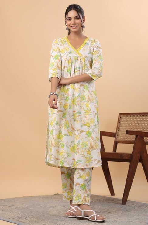 SEO Keywords: cotton floral kurta pant set, white A-line kurta for women, summer cotton kurti set, daily wear ethnic set, v-neck floral printed kurta combo