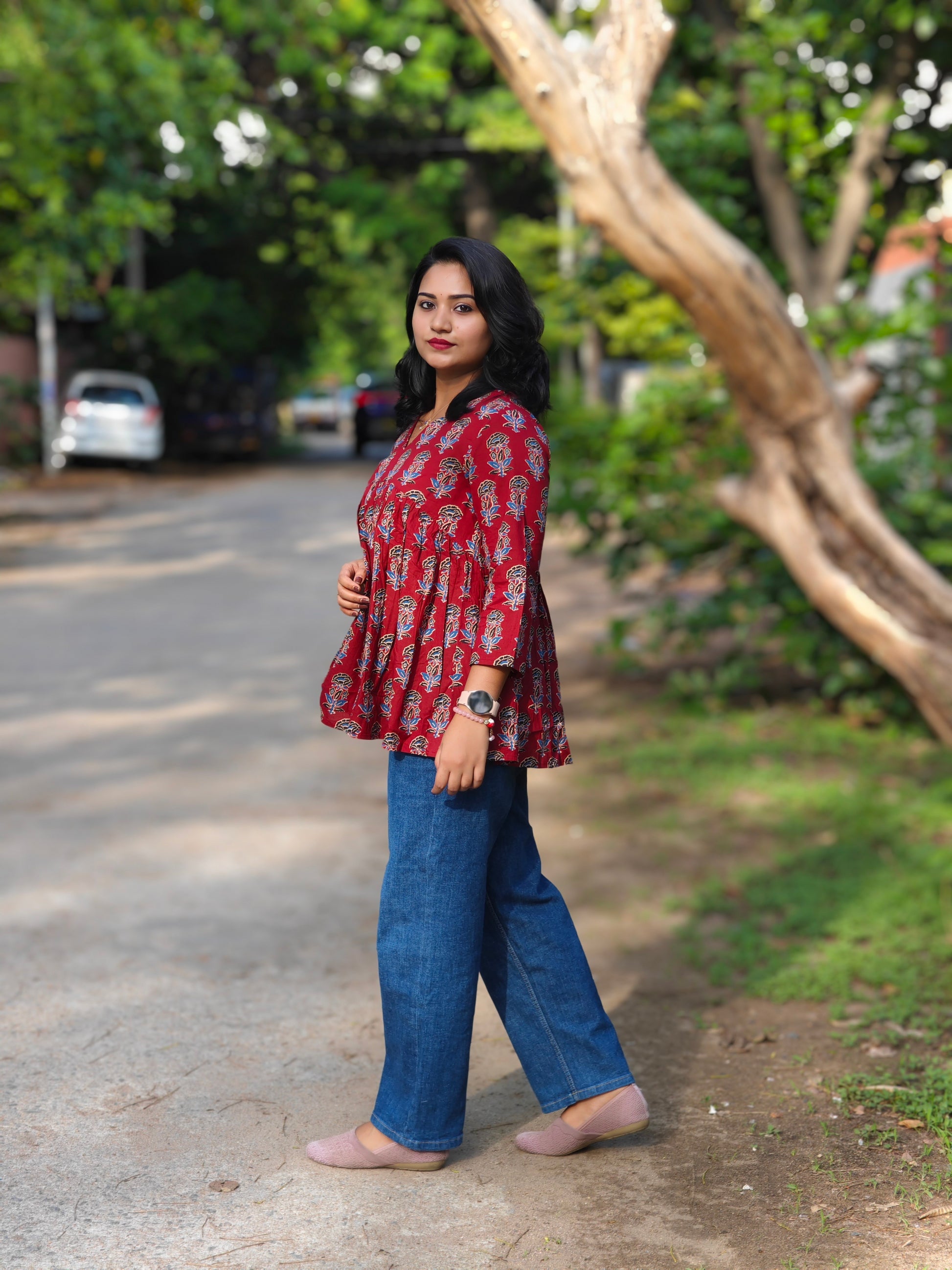 SEO Keywords: Maroon cotton floral block print flared top for women, V-neck cotton blouse S to 3XL