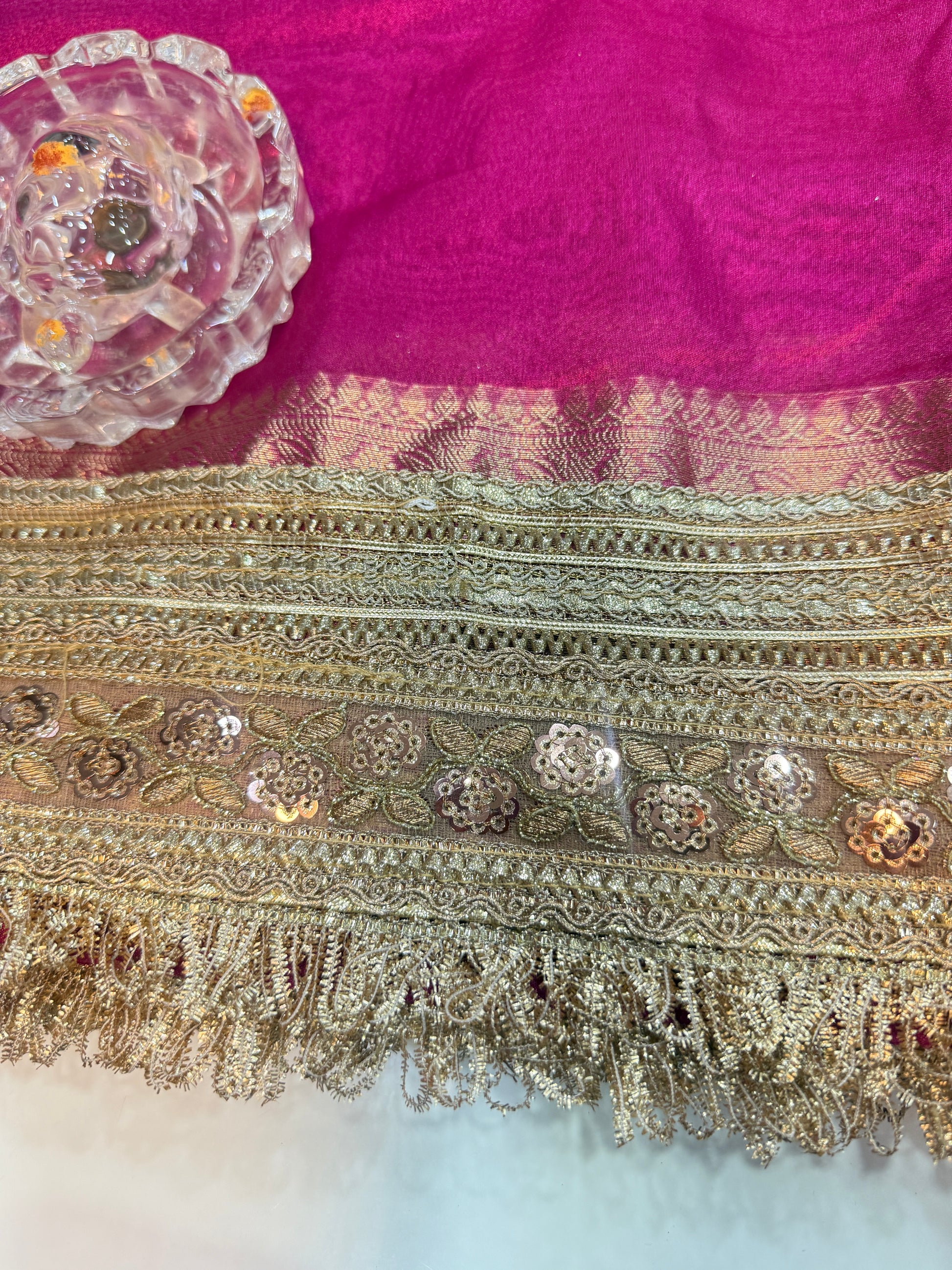 This saree is woven in soft Banarasi katan tissue silk, combining a luminous sheen with a fluid, dressy drape. The body features a rich pink base that catches light beautifully, contrasted by woven gold-toned tissue panels that add depth and dimension across the drape. Along the edges runs a broad, intricately detailed lace-style border in metallic gold, layered with multiple lines of zari, textured patterns and subtle sequin detailing. This border frames the saree from end to end, creating a statement edge that instantly elevates the overall look without needing heavy additional accessories.