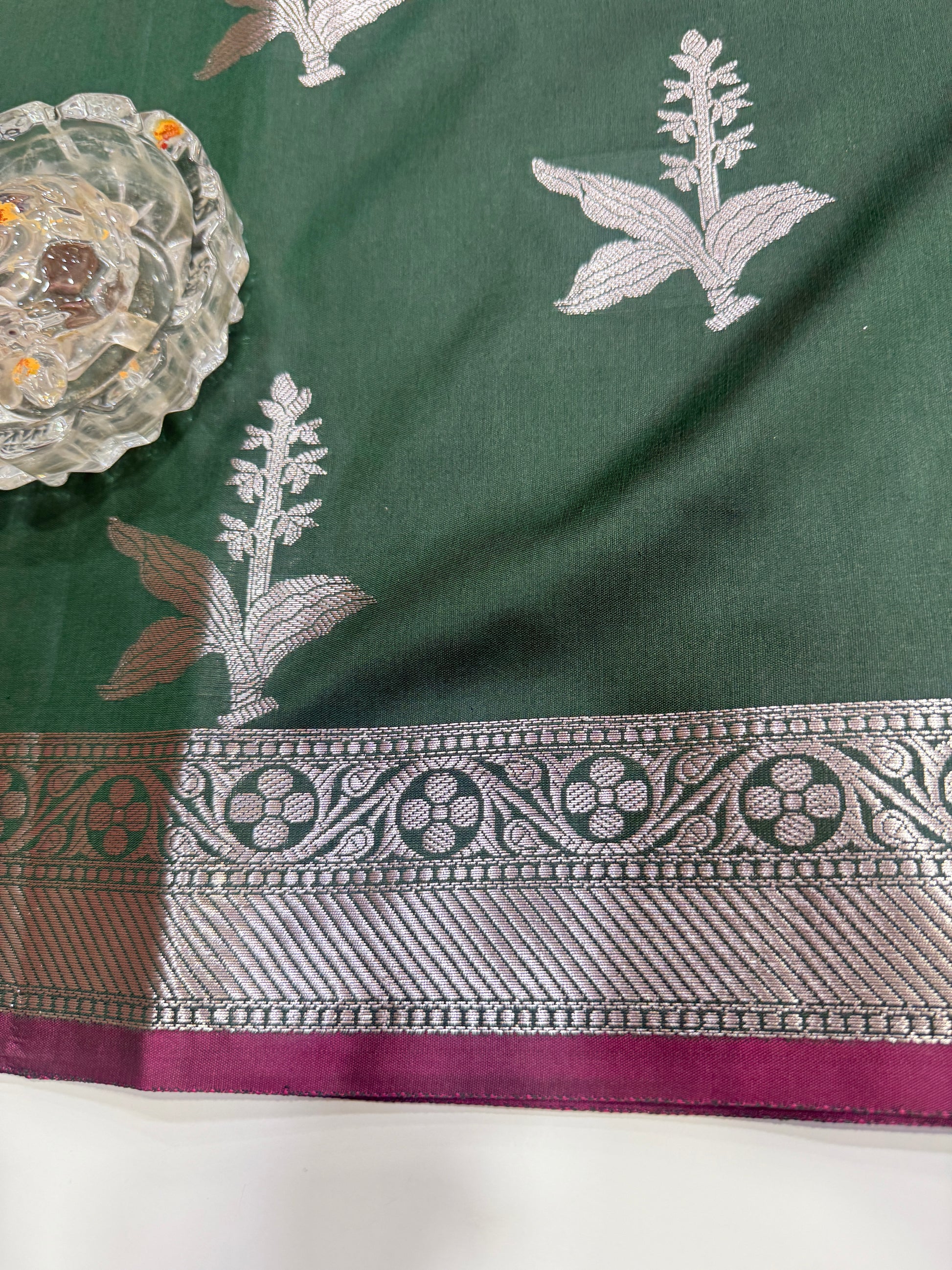 The border is designed with traditional Banarasi motifs that frame the saree beautifully. It continues into a designer pallu with denser weaving, creating a striking contrast between the lighter boota work on the body and the more intricate detailing at the end. This rich pallu makes the saree suitable for celebratory occasions while still keeping the overall feel refined and wearable. The saree is available in graceful shades such as deep green and navy blue, paired with complementary zari tones that enhance the overall look.