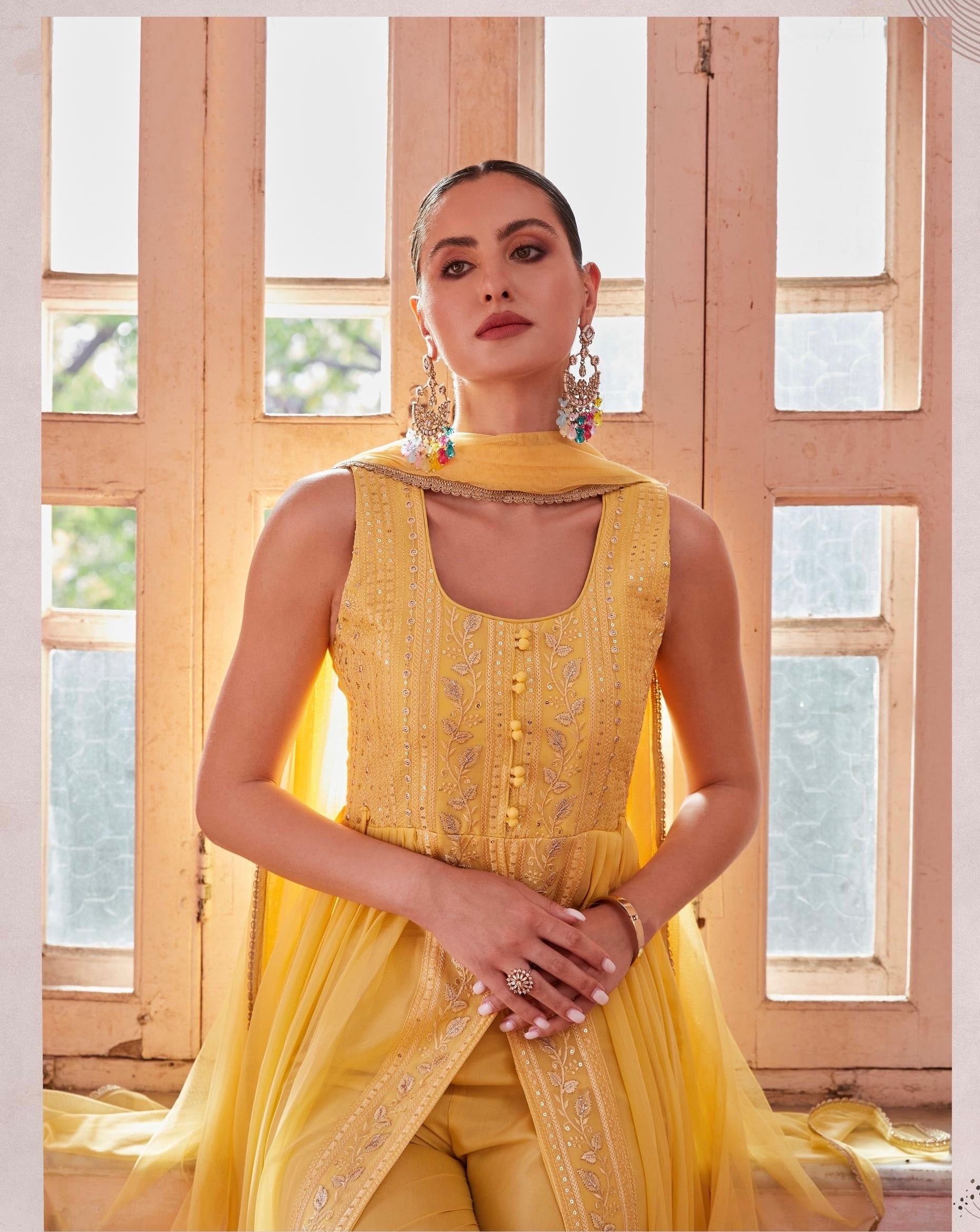 This women’s gown blends traditional ethnic charm with a modern silhouette, making it a versatile outfit for festive occasions, weddings, and parties. Crafted with a grand 8-meter flare, the gown offers a statement-making drape that captures attention while ensuring comfort and ease of movement. Designed in a sleeveless free-size style, it adapts beautifully to different body types, enhancing the wearer’s natural grace. The front slit detailing gives the gown a contemporary touch, making it perfect for those who enjoy fusion fashion. Available in five vibrant colors, this gown is ready to complement your festive wardrobe with elegance and flair.