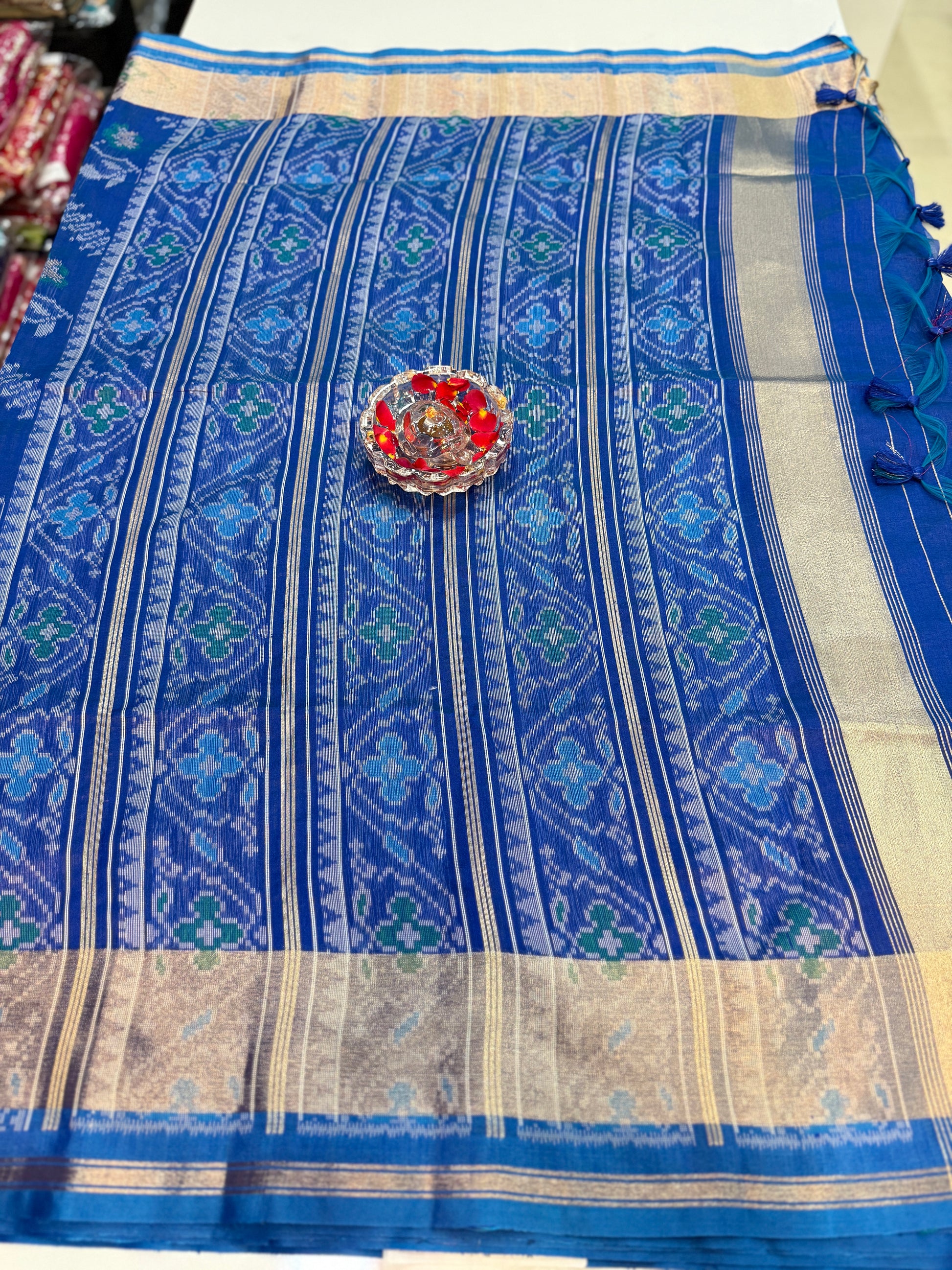 A contrast woven border in a metallic-gold tone frames the saree neatly, adding definition along the edges and enhancing the overall drape. The pallu end is finished with tassel detailing, which adds a handcrafted touch and makes the saree look complete in photos and in-person.