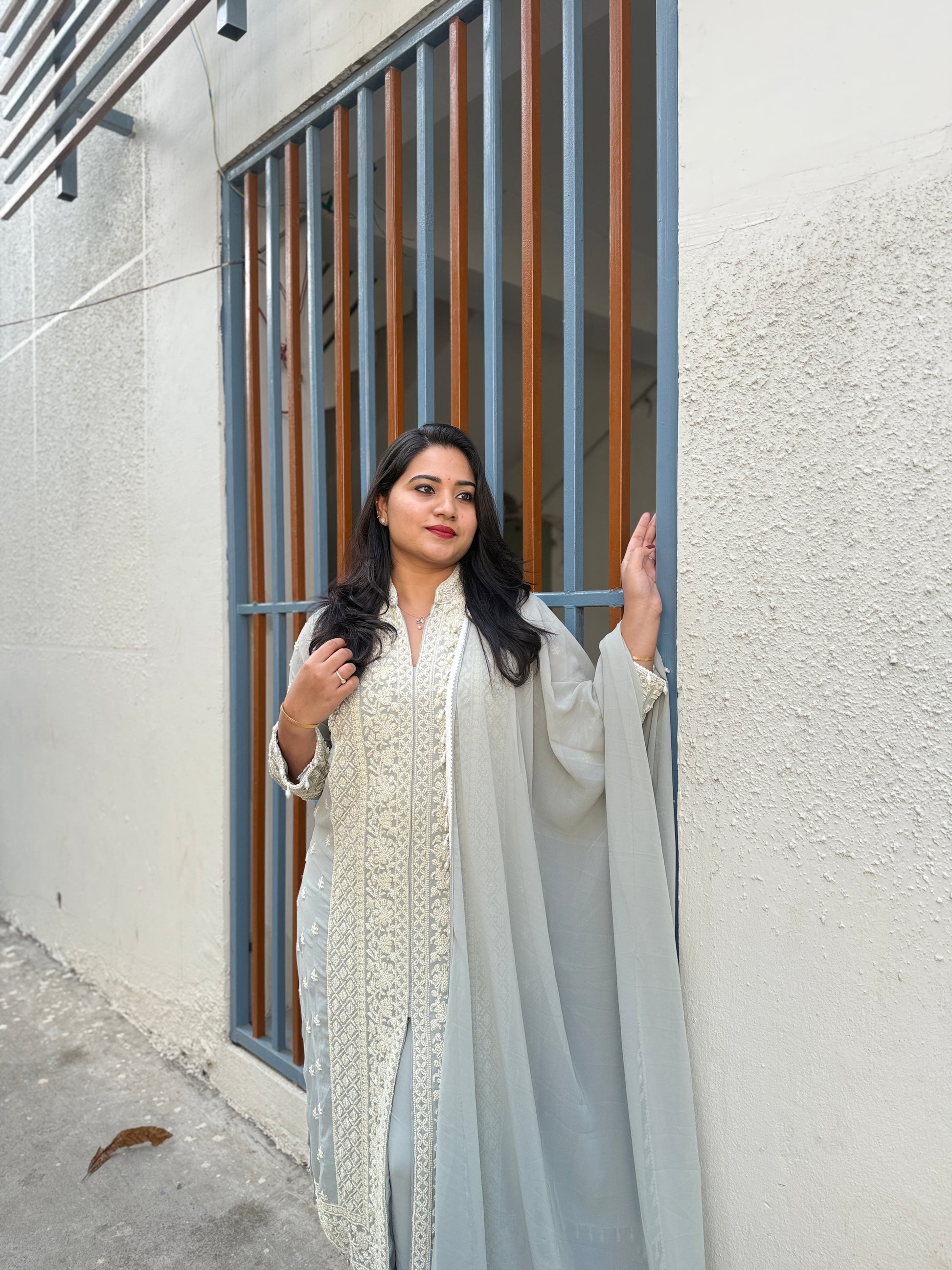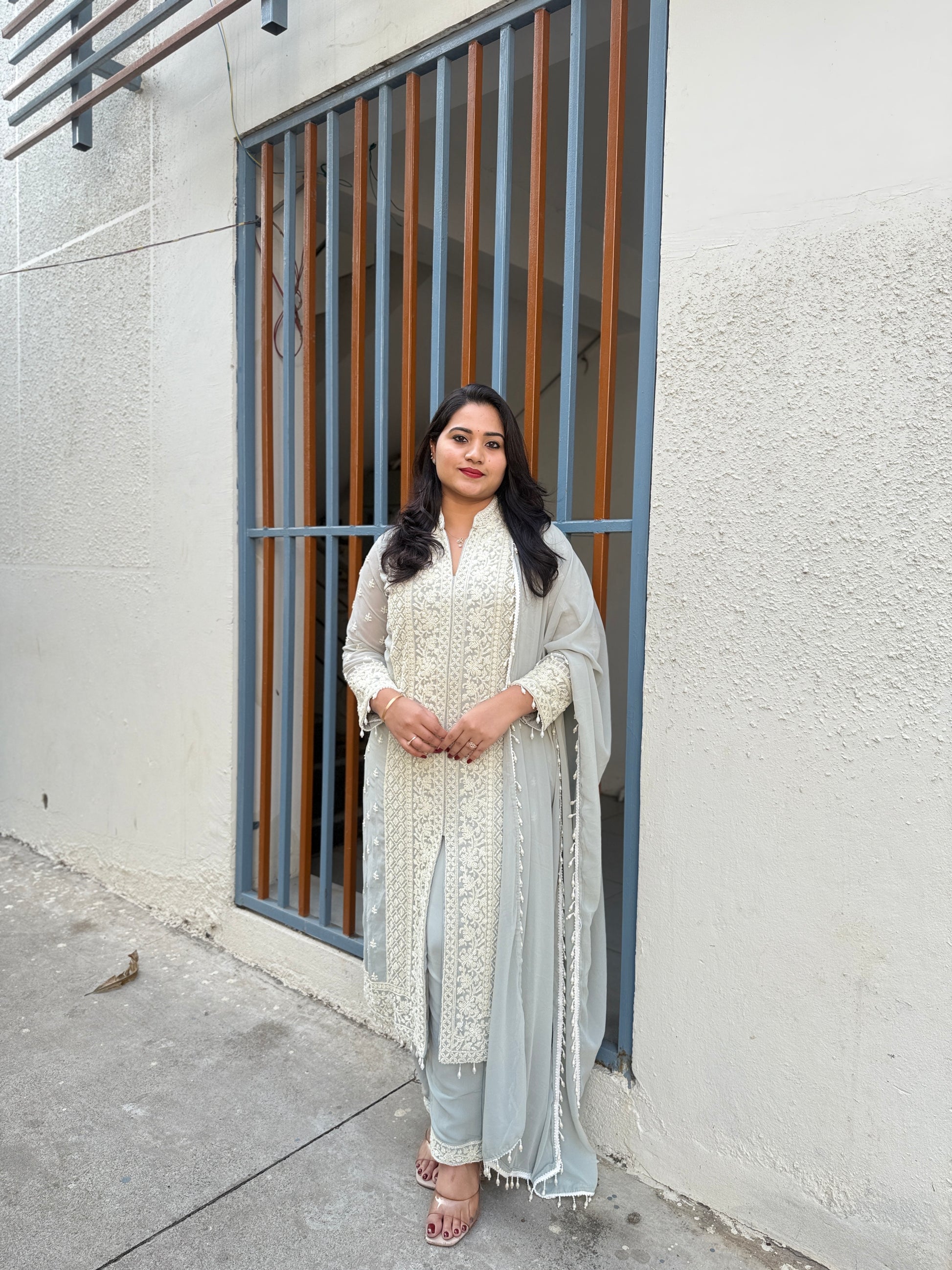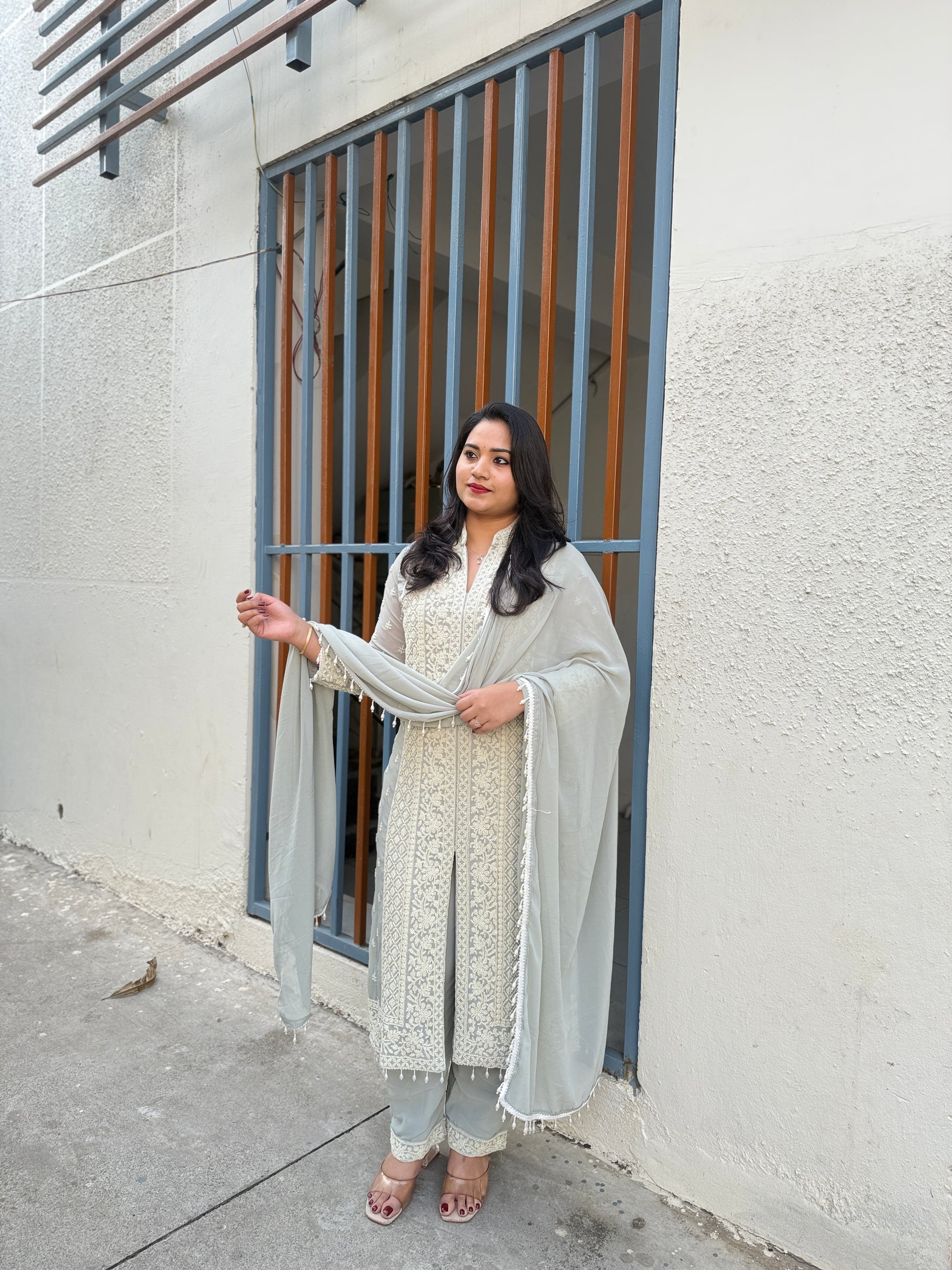The set includes a matching straight-cut palazzo pant in soft georgette for ease of movement, and a coordinated dupatta with light embroidered detailing. The lightweight construction makes the outfit suitable for weddings, receptions, parties, festivals and cultural events.
