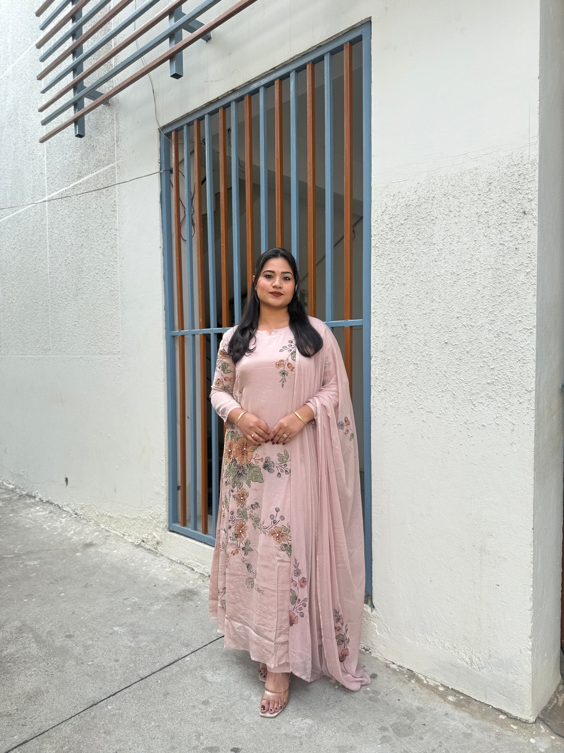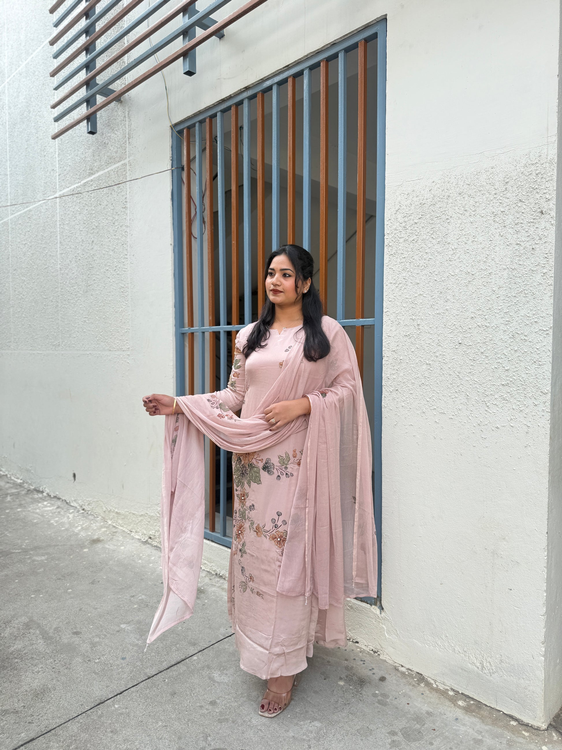 Women’s pure chinnon kurta set with lining, floral handwork detail, pant and dupatta, festive ethnic wear